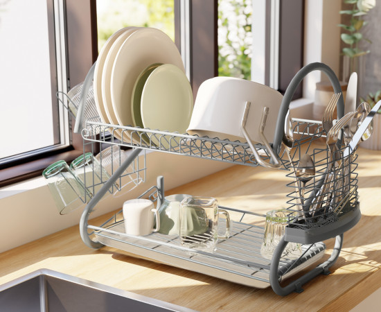 El diseño de dos niveles permite organizar la vajilla de forma eficiente: en la parte superior se pueden colocar platos y tablas de cortar, mientras que en la inferior hay espacio para vasos, tazas o pequeños recipientes. De esta manera, cada utensilio encuentra su lugar y se seca de forma rápida y ordenada.