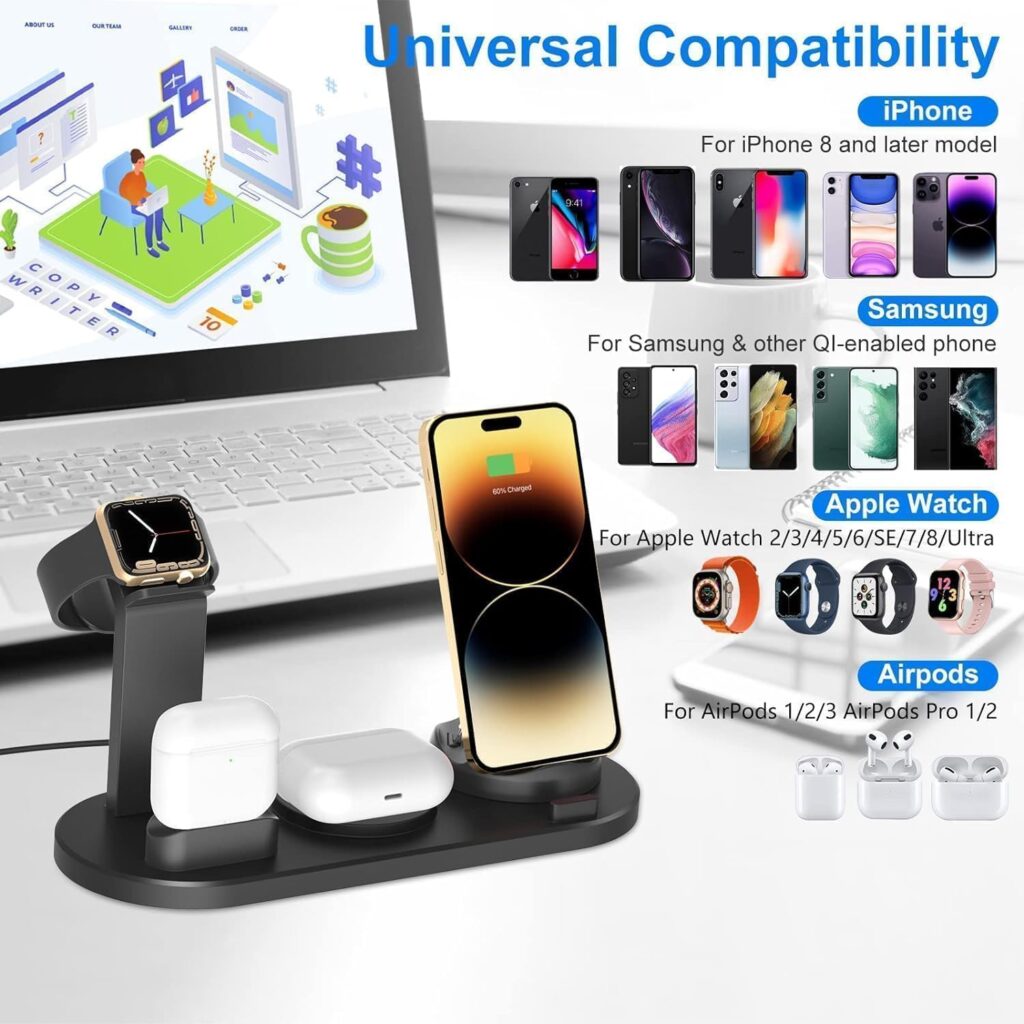 Uno de los aspectos más destacados de esta estación de carga es su compatibilidad con múltiples marcas y modelos. Gracias a su base giratoria de 360°, puede adaptarse fácilmente a dispositivos de Apple, Samsung, Xiaomi y Huawei, ofreciendo una experiencia de carga versátil y sin complicaciones. El soporte para relojes está diseñado específicamente para Apple Watch, aunque es importante señalar que el cargador del reloj no está incluido. Esta característica convierte al dispositivo en una solución integral para quienes utilizan diferentes marcas de smartphones y accesorios.El mejor organizador para tu espacio