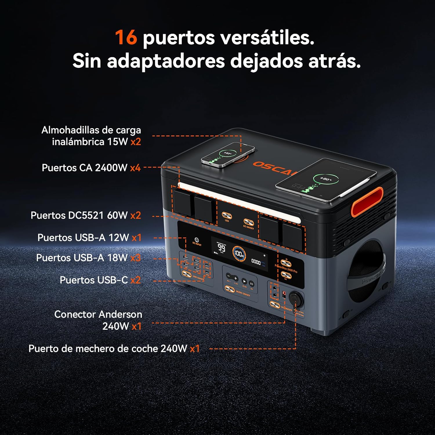 Detrás de su elegante carcasa se esconde un músculo energético capaz de responder sin pestañear a los desafíos más arduos. Con una capacidad de 2016 Wh, este Powermax 2400Pro despliega hasta 2400 W de potencia nominal en cada uno de sus cuatro enchufes de corriente alterna, consumiendo con facilidad el 99 % de los aparatos domésticos, herramientas eléctricas y sistemas de climatización portátil. Cuando llega el pico más demandante, puede estirar su fuerza hasta 4800 W durante algunos segundos.