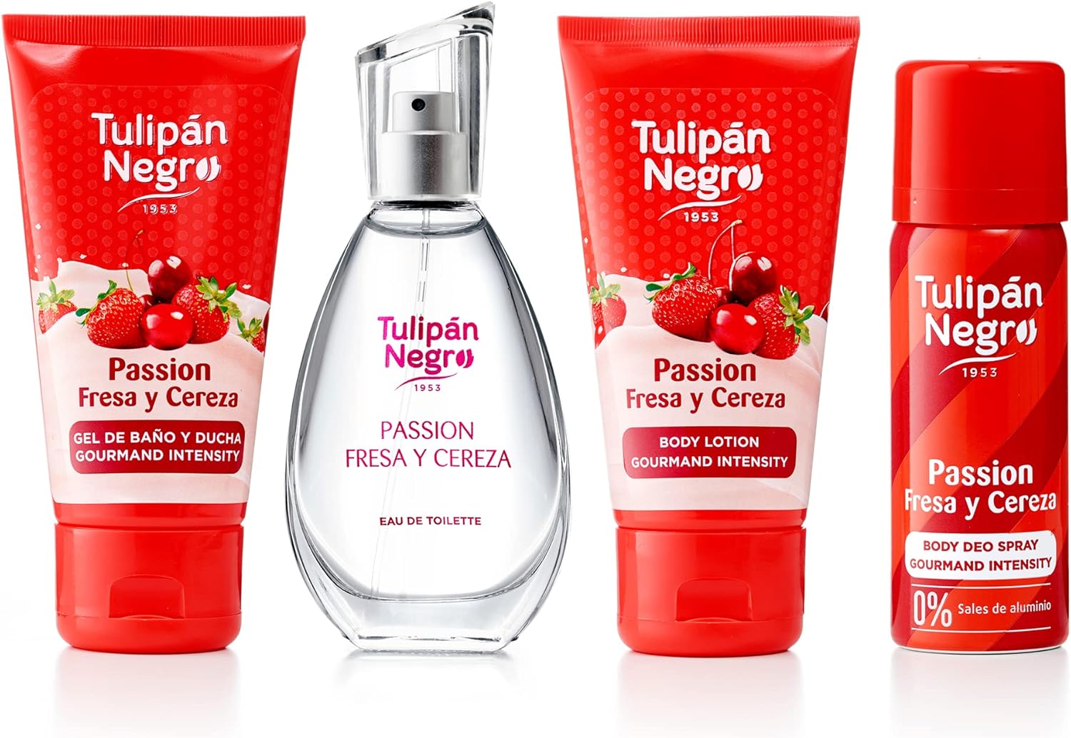 Perteneciente a la colección Gourmand Intensity, este estuche reúne cuatro productos esenciales para una rutina diaria de cuidado corporal: Agua de Colonia 50 ml, Loción Corporal 75 ml, Gel de Baño 75 ml y Desodorante Spray 50 ml. A pesar de su tamaño compacto, ofrece una experiencia completa que permite disfrutar del característico aroma Passion Fresa y Cereza en cada paso del cuidado personal. Su diseño práctico y su contenido equilibrado lo convierten en un set funcional y muy bien pensado.