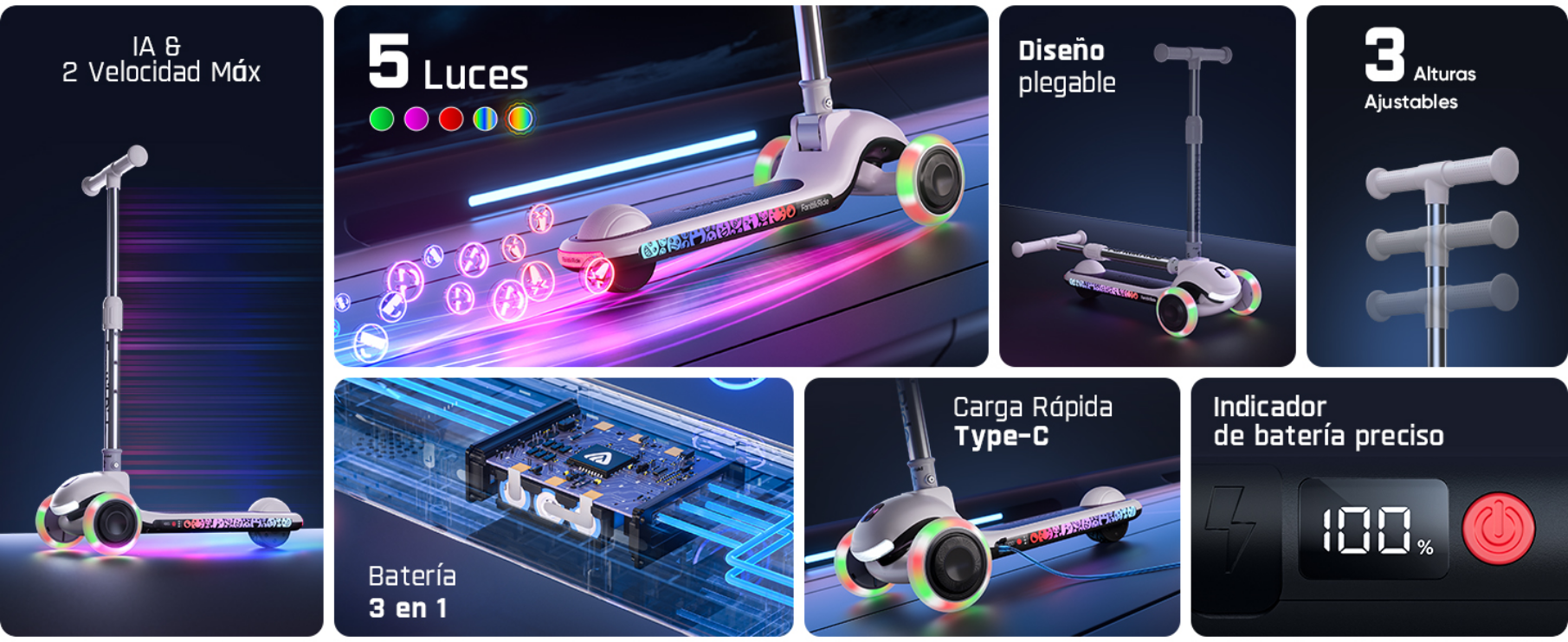 La seguridad también es visibilidad. Este monopatín eléctrico está equipado con 5 modos de luces LED de alta frecuencia. A diferencia de otros sistemas, estas luces ofrecen un efecto visual suave y sin parpadeos, lo que no solo hace que el niño sea visible en condiciones de poca luz o al atardecer, sino que añade un componente de juego y personalización que encanta a los más pequeños.