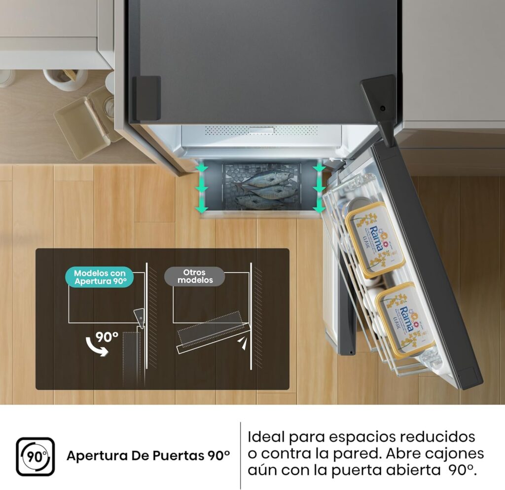 Su bisagra de apertura a 90 grados redefine la forma en que concebimos el uso diario del frigorífico. Cuando el espacio junto a la puerta es limitado, la mayoría de los frigoríficos tradicionales chocan con obstáculos y te obligan a colocar distancias de seguridad. Con el RB343D4CDE, abres la puerta justo lo necesario, y aun así los cajones interiores se deslizan sin restricciones. Olvídate de desplazarte para dejar pasar la puerta: ya no tendrás que reorganizar tu cocina para acomodarlo, porque este modelo se adapta a ti.
