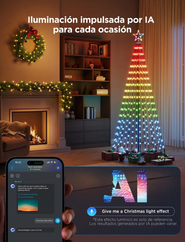 Las Govee Christmas Cone Tree Lights son una solución de iluminación festiva diseñada para crear ambientes llamativos tanto en interiores como en exteriores. Con una estructura en forma de cono que emula un árbol de Navidad, estas luces combinan un diseño imponente con tecnología avanzada para ofrecer un espectáculo luminoso personalizable, resistente y fácil de instalar. Su presencia decorativa funciona igual de bien en fachadas, jardines, plazas y espacios comerciales que en salones o escaparates.La propuesta visual se basa en la tecnología RGBIC con control Uni-IC que permite seleccionar entre 16 millones de colores y ejecutar transiciones por segmentos independientes. Esto convierte cada tira en un lienzo dinámico capaz de mostrar degradados, efectos multicolor y animaciones sincronizadas que no dependen de un solo tono para todo el árbol. El sistema incluye más de 82 modos de escena predefinidos que abarcan desde patrones sutiles y elegantes hasta secuencias festivas y enérgicas, y además permite diseñar tus propios efectos para adaptarlos exactamente al ambiente que buscas. Estas luces integran un micrófono que detecta el sonido ambiental y sincroniza la iluminación con la música en tiempo real, de forma que las LED «bailan» al ritmo de canciones, villancicos o cualquier pista de audio del entorno. Para producciones más complejas o shows coordinados, las Govee son compatibles con la función DreamView, que potencia la sincronización y permite crear instalaciones visuales inmersivas y de gran impacto.