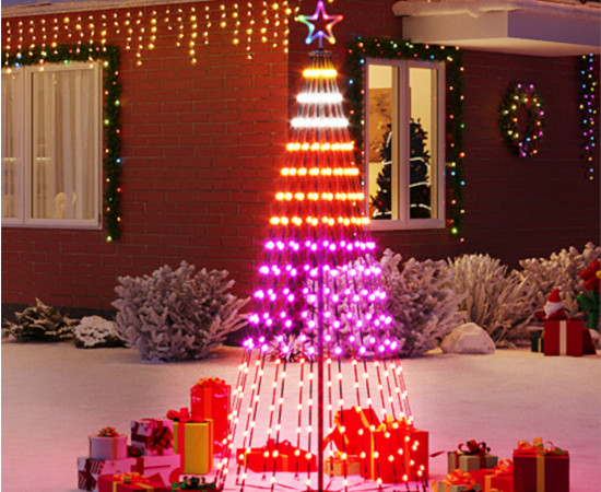 El árbol de luces tiene una altura de 1,82 metros y un ancho de 0,80 metros, con 316 LED distribuidos en 18 tiras y coronado por estrellas brillantes en su cima. Su tamaño y densidad de LED lo hacen visible desde la distancia sin perder definición en los detalles. El diseño modular y los accesorios incluidos simplifican tanto la instalación temporal como el desmontaje y guardado tras la temporada.