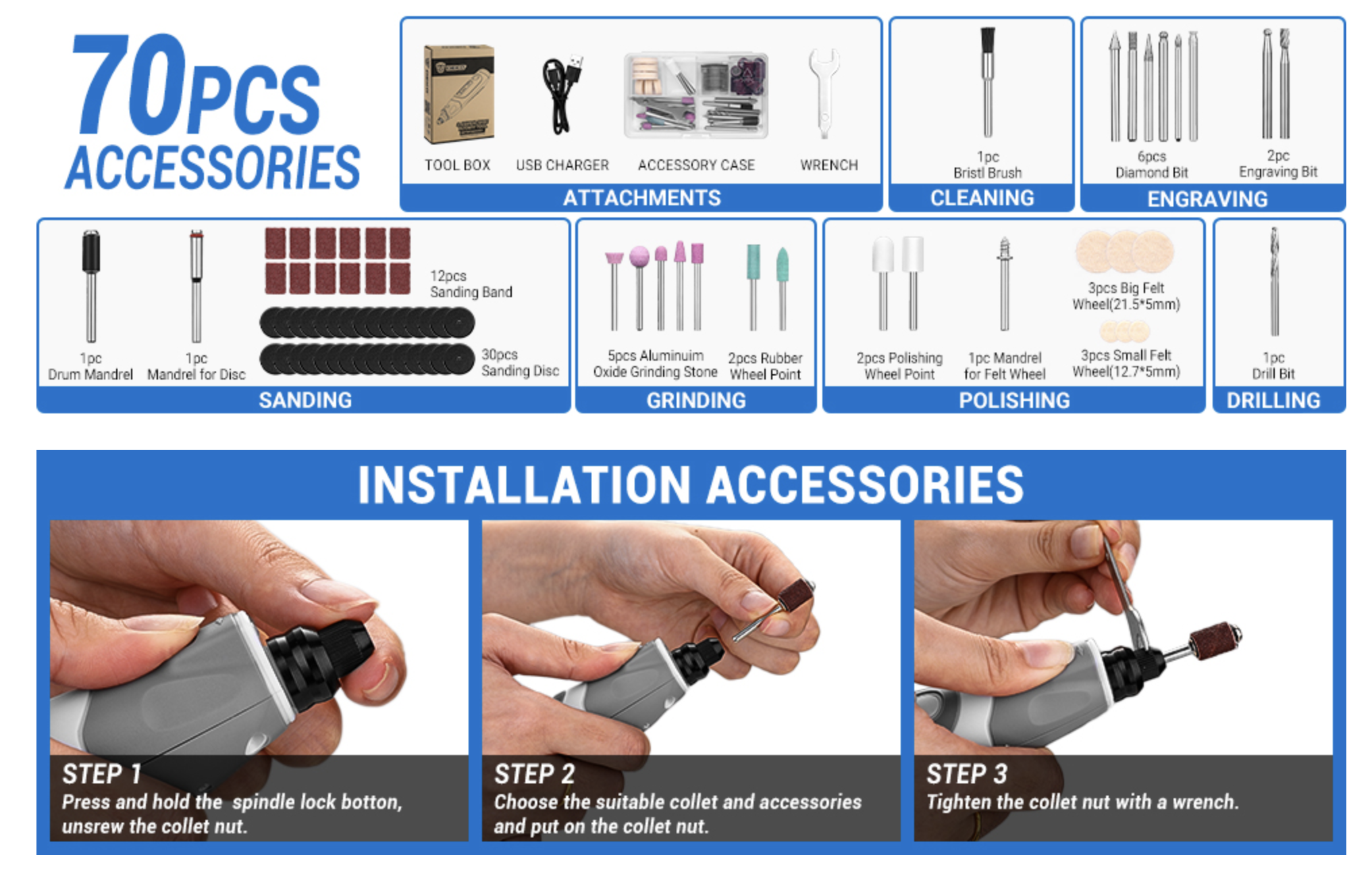 Por último, el kit de 70 accesorios amplía enormemente las posibilidades de uso. Incluye piedras de amolar de óxido de aluminio, puntas de diamante, bandas y discos de lijado, ruedas de pulido, cepillos, puntas de grabado, brocas y diversos mandriles, entre otros elementos. También incorpora ruedas de fieltro, puntas de goma y una llave para ajustes, ofreciendo todo lo necesario para abordar una gran variedad de proyectos.