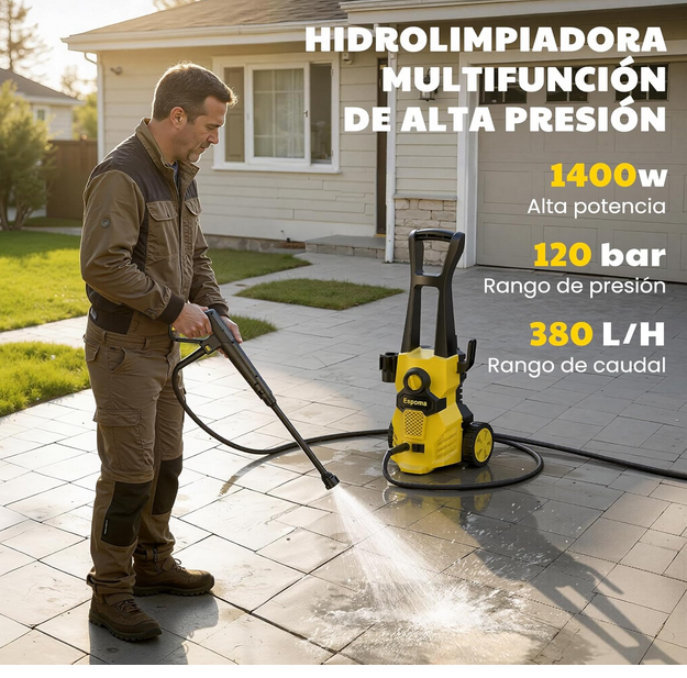 Combinando una potencia equilibrada con una ergonomía pensada para el usuario doméstico moderno, la Espoma integra un motor de 1400 W y una presión máxima de 120 bar, este equipo se posiciona como la herramienta definitiva para quienes buscan resultados profesionales en superficies de tamaño medio sin complicaciones técnicas.Lo que realmente diferencia a la hidrolimpiadora Espoma no es solo su fuerza, sino su inteligencia operativa. Mientras que una manguera de jardín convencional desperdicia una gran cantidad de agua con una presión mínima, este equipo ofrece un caudal máximo de 380 l/h. Esto se traduce en una limpieza mucho más profunda en una fracción del tiempo, logrando desprender la suciedad incrustada en suelos de piedra, vallas o mobiliario de jardín con una facilidad asombrosa.