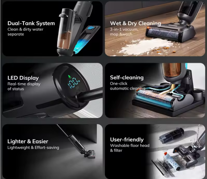 Este aspirador seco y húmedo combina potencia, autonomía y tecnología avanzada para ofrecer una limpieza completa en todo tipo de superficies. Con una succión de hasta 7000Pa, es capaz de eliminar polvo, restos de comida, líquidos y suciedad incrustada, convirtiéndose en un aliado indispensable para la limpieza diaria.