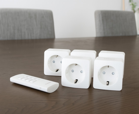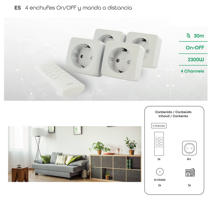 La experiencia de uso no puede ser más sencilla. Incluye un mando que, gracias a su alcance de 30 metros, funciona incluso a través de paredes o cuando te encuentras en el jardín contiguo. Cada botón del mando corresponde a uno de los cuatro enchufes, pero también puedes optar por activar o desactivar todos a la vez con la función “master”. De este modo, si sales de casa y te das cuenta de que has dejado alguna luz encendida, no hará falta recorrer el pasillo para apagarla: presionas un solo botón y despides las sombras de golpe.