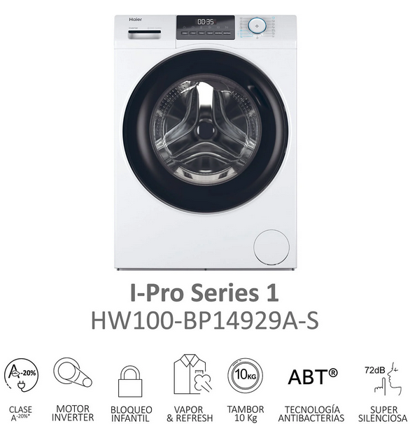 Lavadora HW100-BP14929A-S: eficiencia Clase A-20%, motor Inverter silencioso y tecnología Vapor Refresh por 359€.