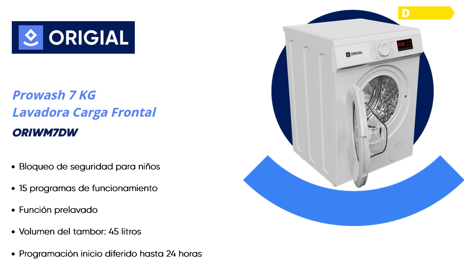 La colada es una de esas tareas domésticas inevitables que, con la lavadora adecuada, puede convertirse en algo rápido, sencillo y hasta cómodo. La lavadora Origial ORIWM7DW ProWash está diseñada para quienes buscan un electrodoméstico fiable, eficiente y con múltiples funciones que se adapten a cualquier estilo de vida. Con su amplia variedad de programas, su capacidad para eliminar bacterias y su diseño pensado para ahorrar tiempo y energía, esta lavadora se convierte en una aliada imprescindible en el hogar moderno.