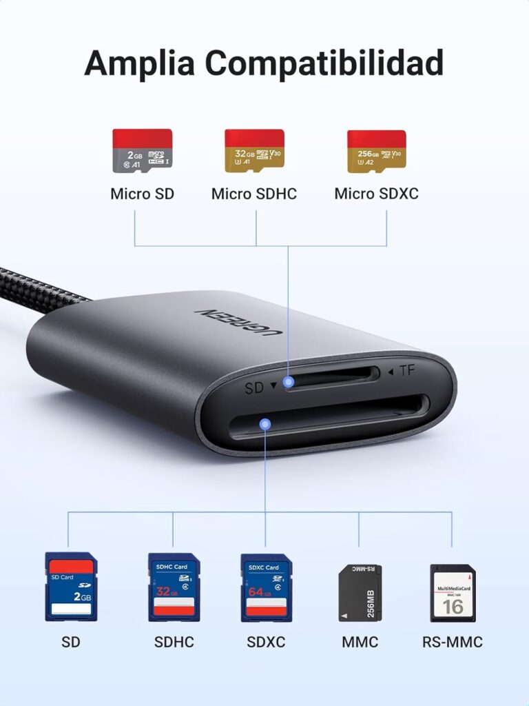 La filosofía de Ugreen con este lector es la simplicidad. Bajo el concepto Plug & Play, el dispositivo no requiere instalación de controladores adicionales. Basta con conectarlo a un puerto USB-C para comenzar a trabajar de inmediato en sistemas Windows, MacOS, Linux, iOS o Android. Su compatibilidad con los formatos de tarjeta más comunes —SD, SDHC, SDXC, MicroSD, MicroSDHC y MicroSDXC— lo convierte en un accesorio versátil, capaz de adaptarse a múltiples escenarios: desde cámaras de acción y drones hasta videocámaras profesionales, cámaras de vigilancia, monitores de automóvil o consolas portátiles.El diseño también ha sido cuidadosamente estudiado. Con un tamaño compacto y ligero, el lector puede guardarse fácilmente en un bolsillo o en la mochila, convirtiéndose en un accesorio de viaje ideal. Su cable integrado evita que los puertos USB adyacentes de un portátil queden bloqueados, un detalle práctico que marca la diferencia en equipos con espacio limitado. Esta portabilidad, unida a su robustez, lo convierte en un compañero fiable tanto para fotógrafos y creadores de contenido como para estudiantes o profesionales que necesitan mover información de un dispositivo a otro con rapidez.