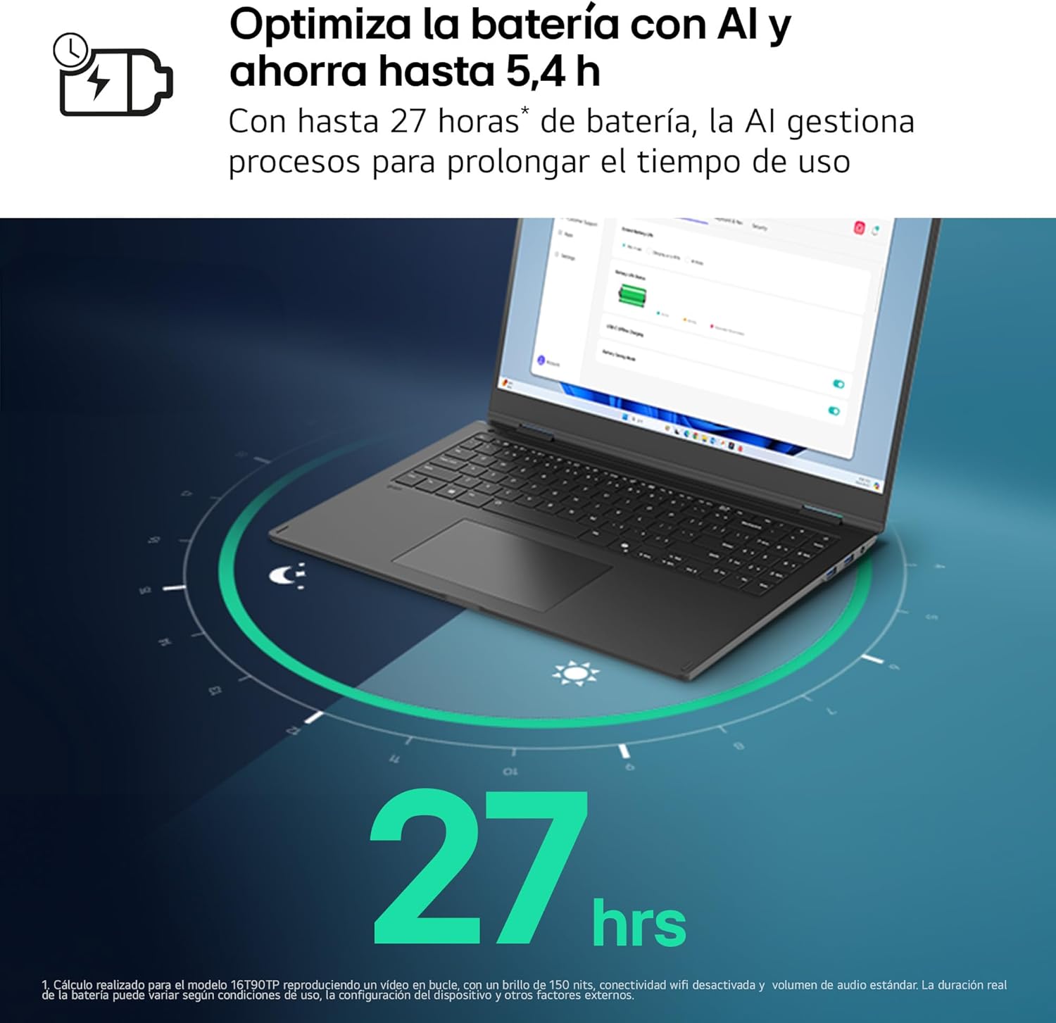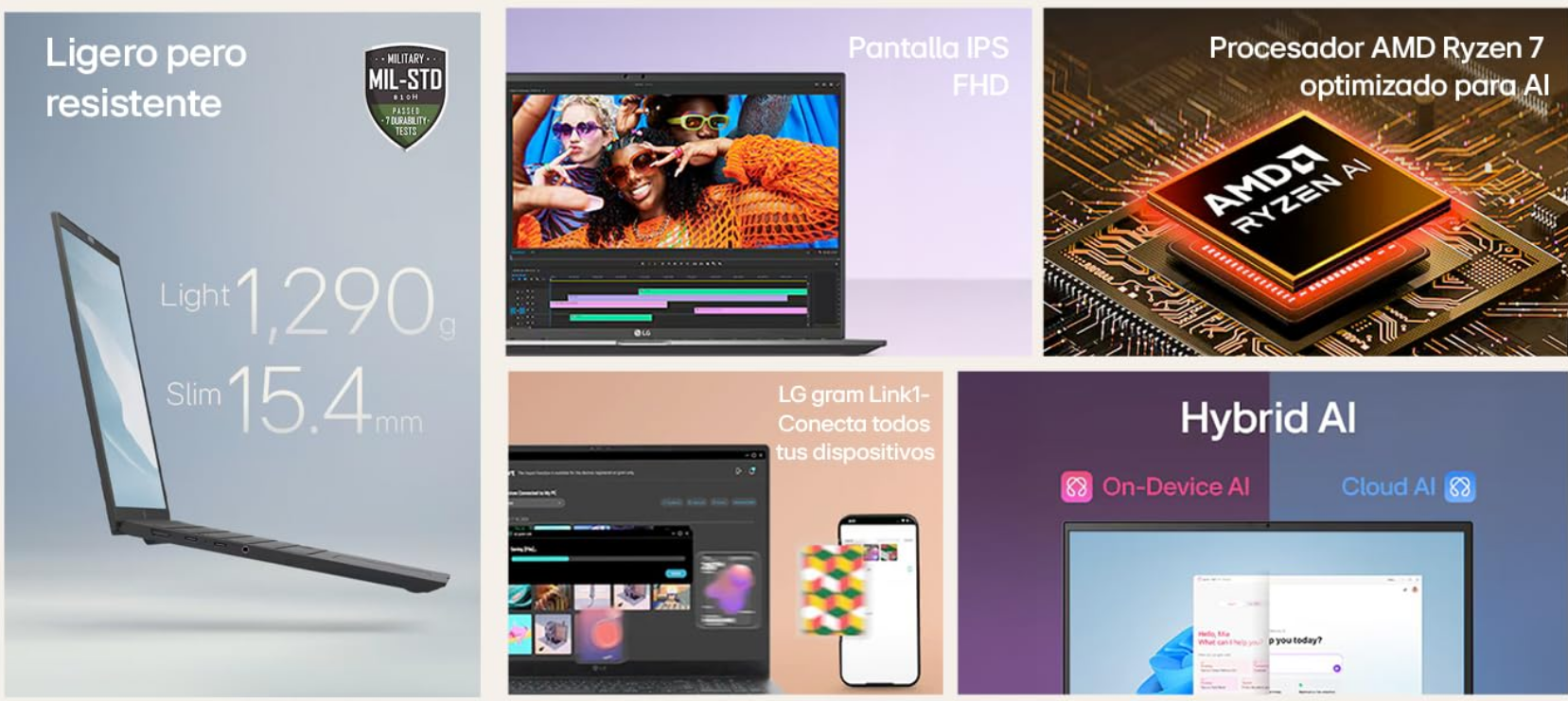 En cuanto al rendimiento, el LG gram está equipado con el procesador AMD Ryzen 5 Zen 3, capaz de alcanzar velocidades de hasta 4,8 GHz. Este chip garantiza un funcionamiento rápido y eficiente, permitiendo gestionar múltiples tareas exigentes con facilidad. Además, el portátil incorpora soluciones avanzadas de gram AI, con hasta 50 TOPS de potencia al servicio de la inteligencia artificial. Esto incluye funciones como Chat On-Device sin conexión a internet y Chat Cloud basado en GPT-4o, que mejoran la productividad y ofrecen herramientas inteligentes directamente en el dispositivo.