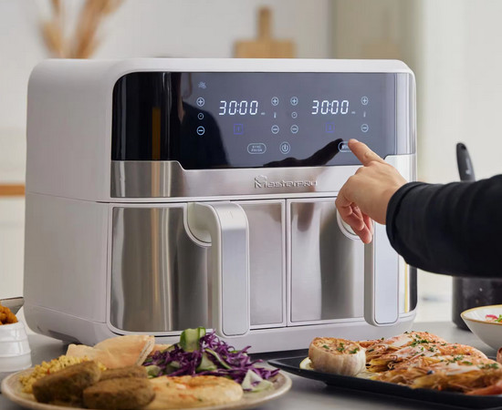 La MasterPro Rocket Duo 900 es una airfryer que ofrece dos compartimentos independientes de 4,5 L cada uno (9 L en total), para cocinar dos recetas al mismo tiempo con temperaturas y potencias diferentes. Olvídate de renunciar al sabor o de tener que esperar turnos: con sus 2400 W de potencia, el Rocket Duo 900 alcanza temperaturas de entre 80 °C y 200 °C en un abrir y cerrar de ojos, asegurando un dorado perfecto y una textura crujiente en cada plato mientras reduce hasta un 90 % la cantidad de grasa respecto a la fritura tradicional.