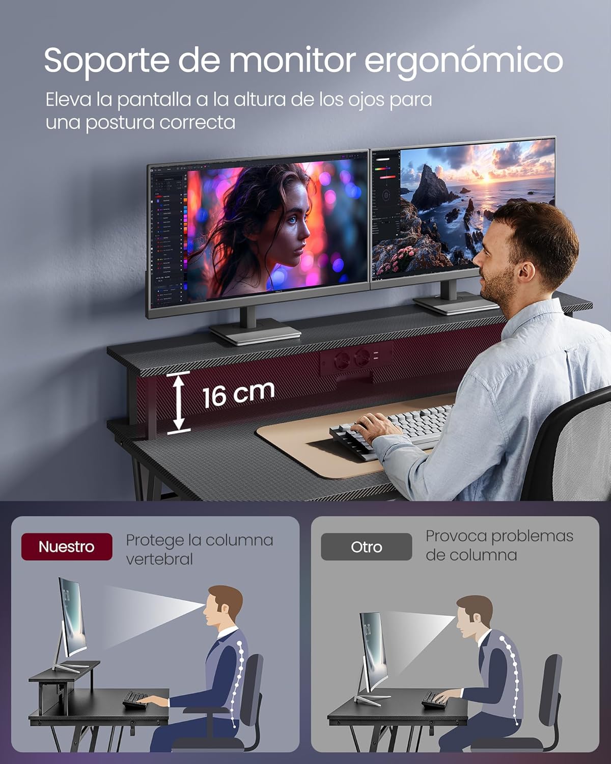 En el curioso pero real ecosistema del gaming y el teletrabajo, la superficie sobre la que operamos es tan crucial como el hardware interno de nuestro equipo. La mesa gaming VASAGLE es una estación de alto rendimiento diseñada para fusionar la comodidad ergonómica con una estética futurista, garantizando que cada sesión sea productiva y visualmente impactante. Uno de los mayores desafíos de pasar largas jornadas frente a la pantalla es la fatiga física. Este escritorio integra un soporte elevado para dos monitores, diseñado específicamente para mantener las pantallas a la altura de los ojos. Esta disposición no es solo estética; es una solución ergonómica que reduce drásticamente la tensión en el cuello y la espalda, permitiéndote mantener una postura natural durante horas. Además, este diseño elevado libera la superficie principal de la mesa, mientras que su compartimento inferior ofrece un espacio extra de almacenamiento. El resultado es un escritorio despejado, ideal para mantener la concentración y un flujo de trabajo organizado.