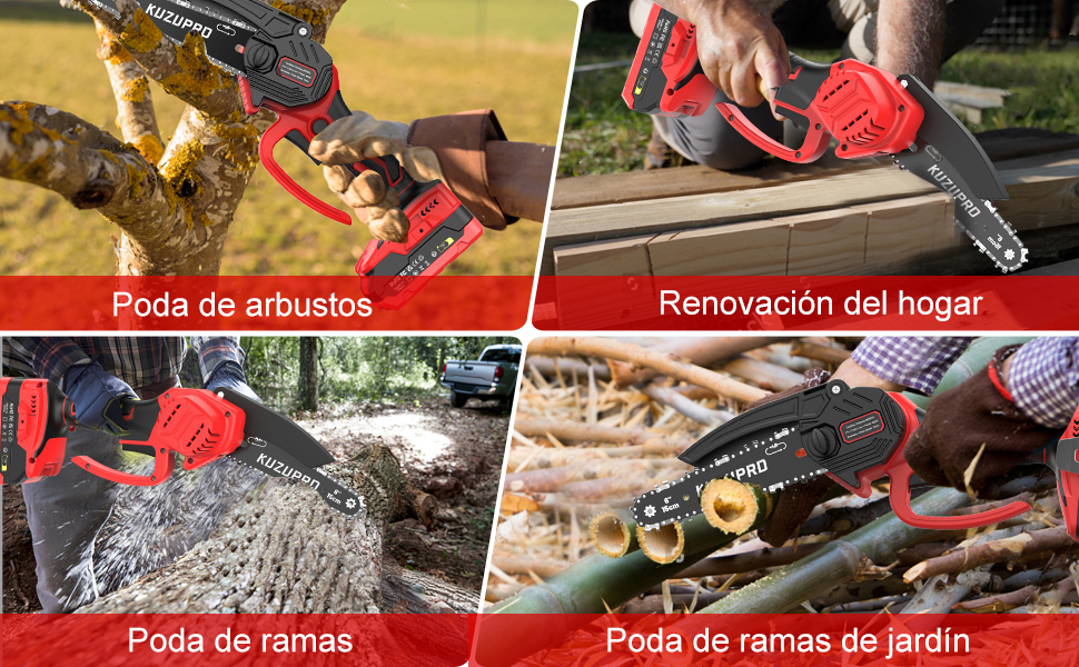 La motosierra a batería Kuzupro es una potente herramienta que viene equipada con un motor sin escobillas que aumenta la vida útil del aparato en un 90%, la potencia de salida en un 80% y reduce el consumo de energía en un 50%. El resultado es una experiencia de corte eficiente con un atasco mínimo, poco ruido y gran eficacia. Con una velocidad de cadena de 10 m/s y una barra guía de 6 pulgadas, sólo tarda unos 8 segundos en cortar troncos de un diámetro aproximado de 4 pulgadas, lo que hace que sea muy fácil de usar.Esta motosierra inalámbrica también cuenta con múltiples protecciones de seguridad, como un deflector protector giratorio y un deflector protector en la empuñadura inferior, un botón de bloqueo y empuñaduras de goma y ergonómicas para la seguridad del usuario. Tienes que pulsar simultáneamente el botón de seguridad y el interruptor para poner en marcha la motosierra. El mango proporciona un agarre cómodo y un mejor control, logrando un equilibrio perfecto con un alto rendimiento de corte.