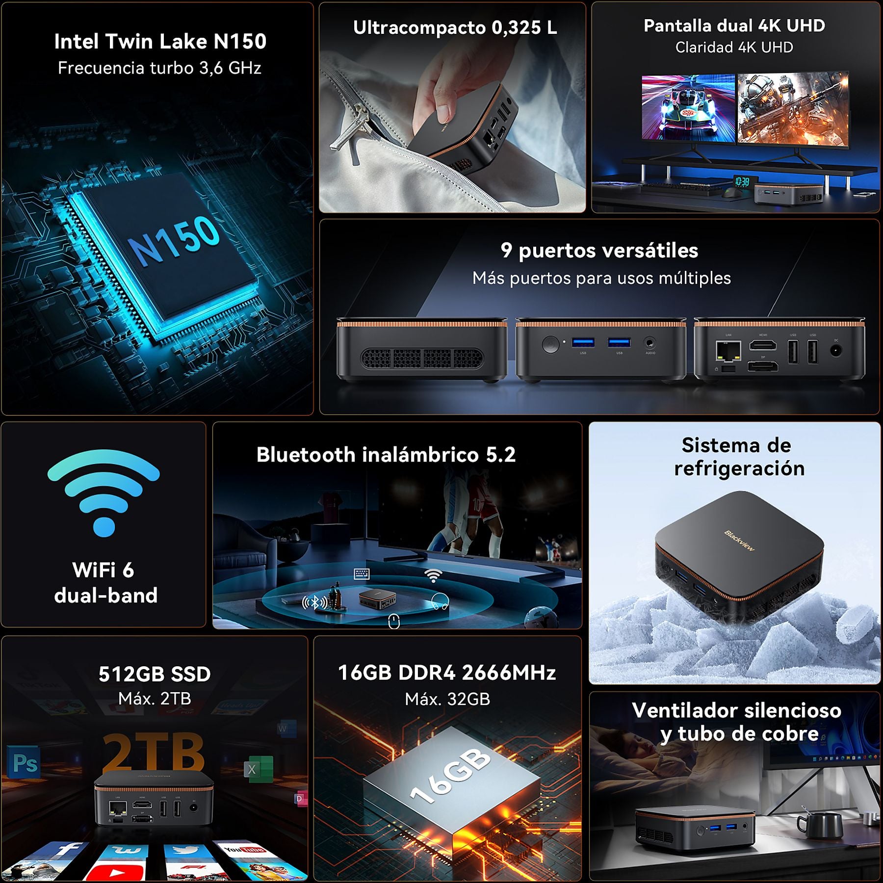 Con un total de 9 puertos versátiles, incluyendo USB 3.2 de alta velocidad (hasta 10 Gbps) para transferencias de datos ultrarrápidas, puertos USB 2.0 para periféricos estándar y una salida de audio de 3.5mm, el Blackview MP20-3300 se posiciona como el centro neurálgico de cualquier setup moderno. Es, en definitiva, la combinación perfecta entre diseño minimalista y potencia máxima.
