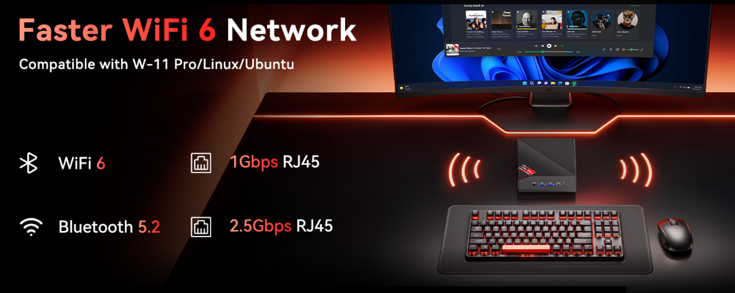 El AM06 Pro está pensado para integrarse en cualquier entorno: dispone de 2 puertos Ethernet Gigabit RJ45, 1 DP, 1 HDMI 2.0, 2 USB 3.0, 2 USB 2.0, 1 jack de 3,5 mm y 1 USB 3.2 Gen2 Tipo‑C. Esta variedad facilita la conexión a servidores, monitores, impresoras y equipos de oficina sin adaptadores adicionales. Su chasis compacto y ligero admite montaje VESA y se transporta cómodamente en un bolso, convirtiéndose en la opción práctica para profesionales en desplazamiento y entornos con espacio limitado.