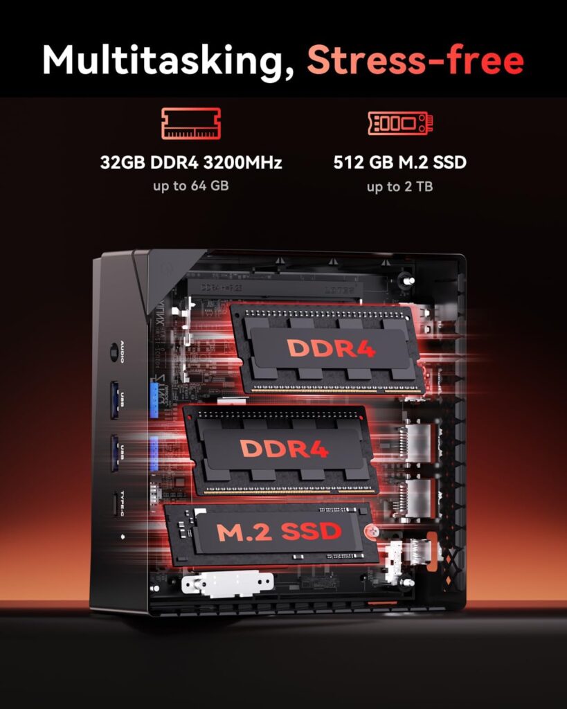 El NiPoGi AM06 Pro ofrece lo que se espera de una mini PC: potencia de sobremesa en un formato compacto y transportable. Diseñada para usuarios que requieren rendimiento real sin sacrificar espacio ni movilidad, combina un procesador de alta gama, memoria y almacenamiento ampliables, conectividad moderna y salida de video avanzada para responder a tareas exigentes en oficina, creación de contenidos y entretenimiento doméstico.