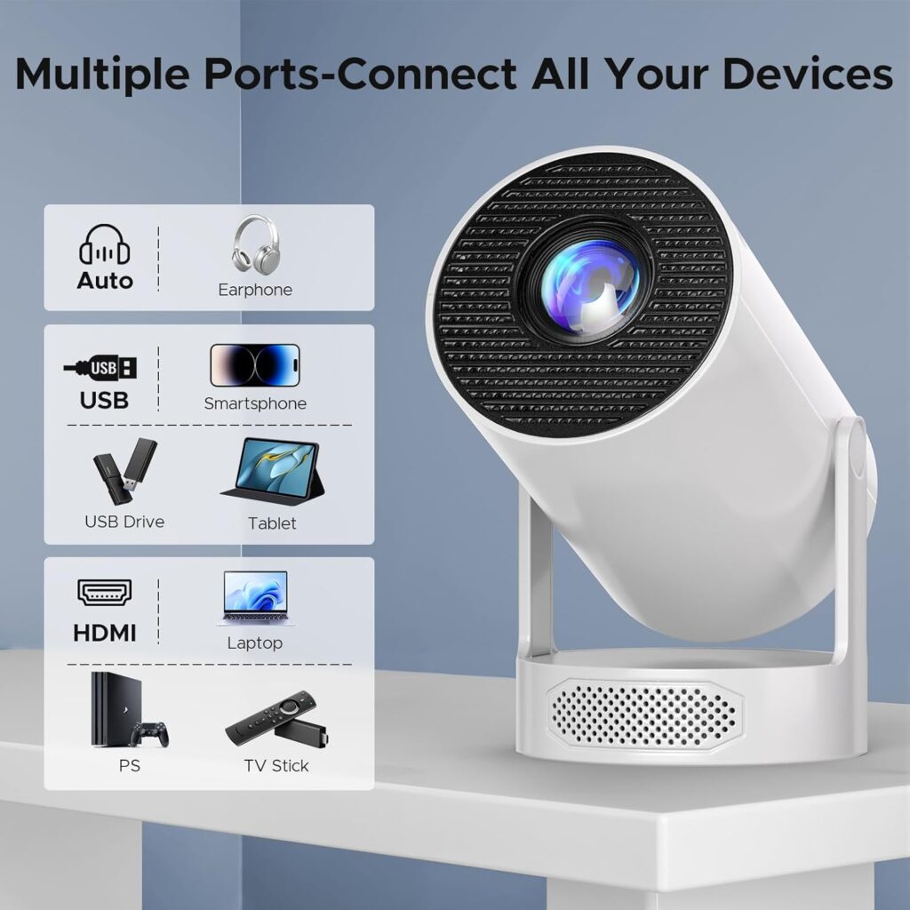En el terreno de la conectividad, el mini proyector Camworld incorpora la última generación Wi-Fi 6 de doble banda —5 GHz y 2,4 GHz— para ofrecer transmisiones estables y resistentes a interferencias. Con soporte para Miracast, AirPlay y DLNA, proyectar la pantalla de tu móvil o tablet se convierte en un proceso instantáneo. El Bluetooth 5.0 integrado añade versatilidad, permitiéndote emparejar auriculares o altavoces externos y crear un ambiente de audio privado sin cables. Conviene recordar que esta conexión inalámbrica de Bluetooth sirve únicamente para trasladar audio a dispositivos compatibles, y no permite duplicar la imagen de un smartphone.Por último, quienes buscan flexibilidad en sus sesiones audiovisuales agradecerán la presencia de un puerto HDMI, un USB y una toma de auriculares de 3,5 mm. Esto garantiza que puedas enlazar desde memorias USB y dongles de TV hasta consolas como la PS5 o ratones inalámbricos, extendiendo las posibilidades de uso a presentaciones, juegos o sesiones de cine improvisadas. Ten en cuenta que los cables HDMI y USB no se incluyen, y que los ordenadores portátiles y de sobremesa no pueden conectarse al proyector mediante Bluetooth; para ello deberás utilizar un cable HDMI.
