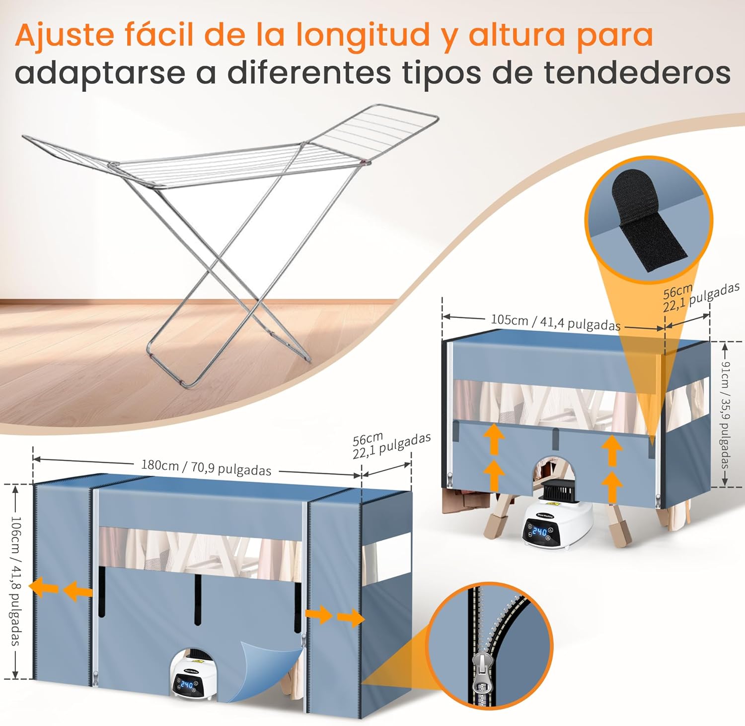 Su funda de tela plegable está diseñada para ocupar el mínimo espacio cuando no se utiliza. Esta funda no solo protege la ropa del polvo y la humedad exterior, sino que también ayuda a concentrar el calor en el interior, acelerando el secado. Su estructura es ajustable en altura y longitud, lo que permite adaptarla a distintos tipos de tendederos y configuraciones domésticas. Además, incorpora cremalleras laterales que facilitan el acceso a las prendas sin necesidad de desmontar nada, una característica especialmente útil cuando se quiere revisar el estado del secado o retirar una prenda concreta.