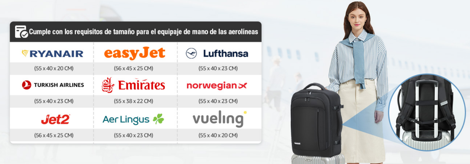 El mayor temor de cualquier viajero frecuente es llegar al mostrador de facturación y que su equipaje no encaje en el medidor. Esta mochila ha sido diseñada con precisión matemática para cumplir las normativas de tamaño de Ryanair, así como de las principales operadoras globales como Vueling, EasyJet, Iberia, KLM y British Airways.