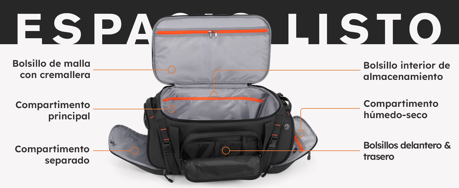 Otro de sus puntos fuertes es el sistema de compartimentos húmedo/seco, una característica esencial para deportistas. La bolsa impermeable fabricada en aluminio 600D ecológico —con certificación RoHS— permite guardar ropa mojada, toallas o accesorios húmedos sin riesgo de filtraciones ni malos olores. Este espacio independiente se complementa con rejillas de ventilación y un bolsillo de malla pensado para artículos de higiene personal. En el lateral, la mochila incorpora una bolsa específica para zapatos, con capacidad para tallas grandes (46–48), que también puede utilizarse para ropa sucia o accesorios voluminosos. Esta combinación convierte a la mochila en una aliada perfecta para entrenamientos intensos, viajes cortos o actividades al aire libre.