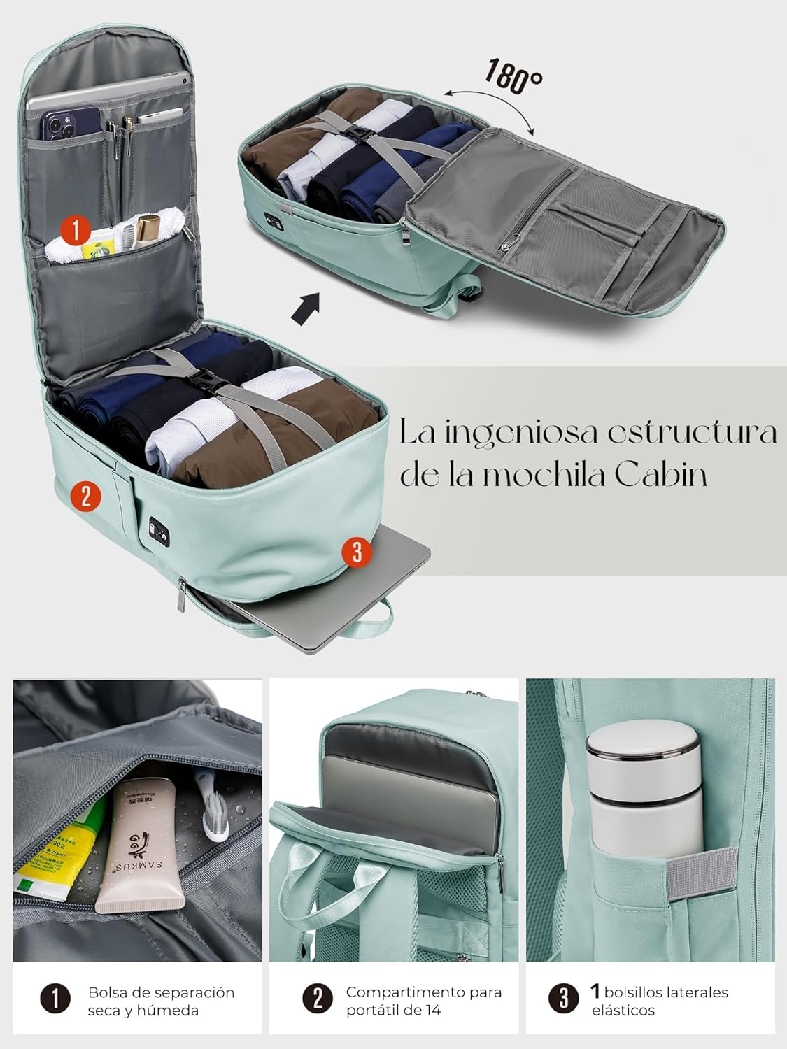 El diseño multipráctico es otro de sus grandes atractivos. La mochila incluye un puerto de carga USB, que permite mantener dispositivos conectados y cargados en todo momento, una ventaja indispensable para quienes trabajan o se comunican constantemente mientras viajan. Además, su correa superior facilita colgarla en lugares estratégicos, como el gancho detrás de la puerta del baño del aeropuerto, ofreciendo comodidad incluso en los momentos más apresurados.