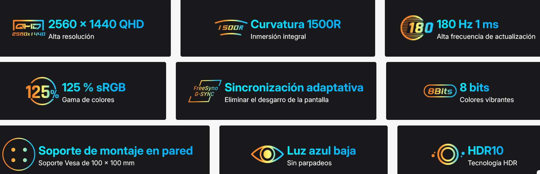 El monitor curvo KTC H32S17 es una excelente elección para quienes buscan una experiencia de visualización inmersiva, ya sea para el gaming o el trabajo diario. Este monitor destaca por su diseño curvado de 1500R, una característica que no solo mejora la experiencia visual, sino que también contribuye a reducir la fatiga ocular. Al envolver suavemente la vista, este panel curvo permite que los ojos capten toda la pantalla sin esfuerzo, sumergiendo al usuario en el contenido de manera más natural y placentera. Esta curvatura es particularmente útil para juegos y películas, ya que crea un campo de visión más amplio y envolvente, lo que resulta en una experiencia mucho más satisfactoria y libre de distracciones.Con una impresionante resolución de 2560 x 1440 píxeles (2K QHD), este monitor ofrece imágenes extremadamente nítidas y detalladas. Esto es ideal tanto para gamers que requieren una visión clara y precisa de los detalles en sus juegos, como para profesionales que necesitan una alta definición para trabajos de diseño gráfico, edición de video o cualquier tarea que requiera una precisión visual superior. Además, el panel de 8 bits es capaz de reproducir 16,7 millones de colores, cubriendo un espacio de color sRGB del 125%, lo que asegura una reproducción de colores vibrante y realista. Esta capacidad de representar una amplia gama de colores permite que las imágenes y los gráficos se vean mucho más ricos y naturales, mejorando considerablemente la experiencia visual y haciendo que cada detalle cobre vida.