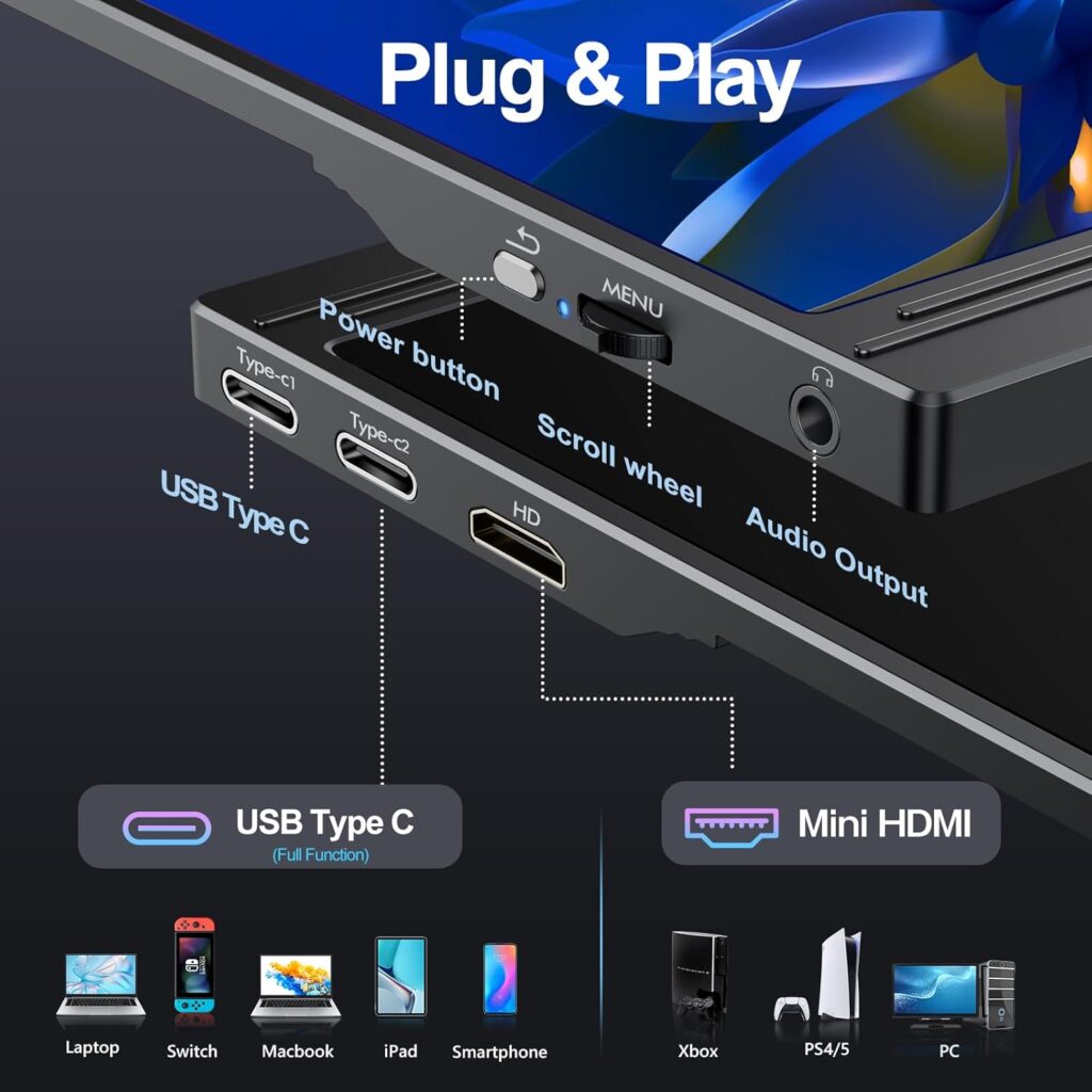 Equipado con dos puertos USB Tipo-C y un puerto Mini HDMI, el monitor ofrece una solución versátil para casi cualquier dispositivo moderno. Es totalmente compatible con portátiles, PC, Mac y dispositivos móviles. Incluso para los entusiastas del «gaming», es la pareja perfecta para consolas como PS5 y Xbox, permitiendo jugar en alta definición en cualquier rincón del hogar o fuera de él.