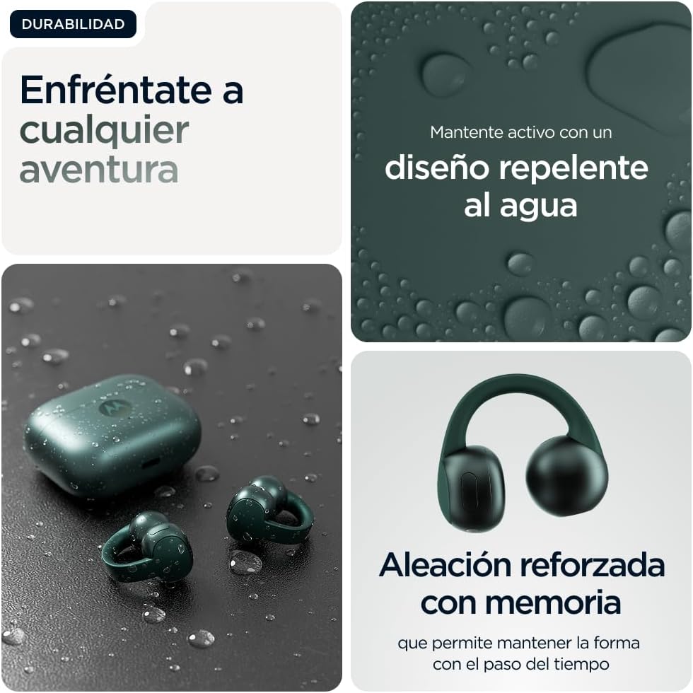 Construidos para resistir las aventuras diarias, estos auriculares cuentan con materiales de primera calidad y un diseño repelente al agua. Esta protección asegura que ni el sudor durante un entrenamiento intenso ni una lluvia inesperada comprometan su funcionamiento. En cuanto a la autonomía, los Moto Buds Loop son líderes en su clase: