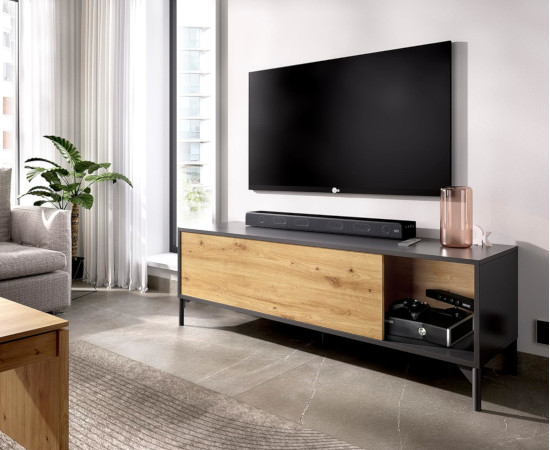 El mueble de TV bajo LAK de Dekit Rimobel es una pieza pensada para quienes buscan unir practicidad, diseño contemporáneo y resistencia en un solo elemento del salón. Su estética combina el acabado en color Grafito con el tono cálido Nordic, una mezcla que aporta equilibrio entre modernidad y naturalidad, logrando que encaje con facilidad en distintos estilos decorativos, desde ambientes minimalistas hasta espacios de inspiración industrial o nórdica.