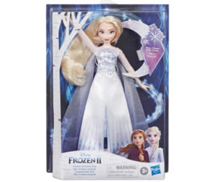 Esta versión de la princesa Elsa, viene vestida con el traje que lleva tras descubrir la magia antigua en la segunda película de Frozen, su vestido de viaje, así como su brillante capa y unas bonitas sandalias de tiras, son los complementos que luce así como su preciosa melena rubia suelta y libre de su característica trenza. Se trata de una versión que funciona con tres pilas de botón (incluidas en la muñeca), que permite escuchar la canción “Show Yourself” de la película Frozen 2 de Disney.