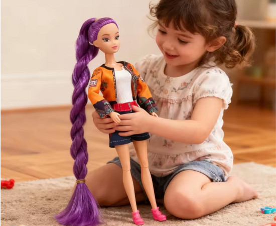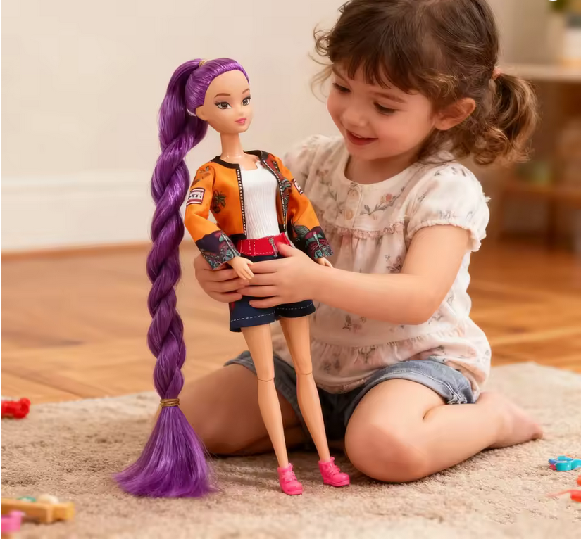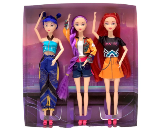 Cada muñeca representa una faceta del equipo: la estratega de cabello azul con moños dobles, vestida en tonos turquesa y dorado, transmite energía y precisión. La líder de cabello morado trenzado, con chaqueta multicolor y shorts vaqueros, encarna el equilibrio entre estilo y fuerza. Y la rebelde pelirroja, con su conjunto negro y naranja de diseño gráfico, aporta intensidad y fuego al grupo. Juntas forman un escuadrón de cazadoras con estética K-pop, listas para enfrentar cualquier desafío con ritmo, moda y poder.