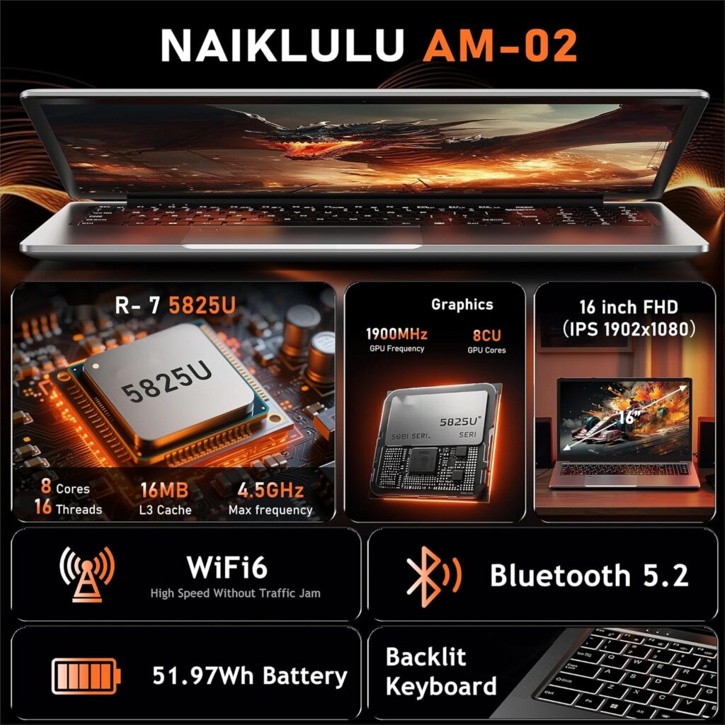El centro de la experiencia del Naiklulu AM-02 es su impresionante pantalla Full HD de 16 pulgadas. Con una resolución de 1920×1080 y una relación de aspecto 16:9, la nitidez está garantizada en cada fotograma. Lo que realmente diferencia a este modelo son sus marcos ultraestrechos de solo 4 mm, que permiten alcanzar una relación pantalla-cuerpo del 90%. Esta ingeniería visual ofrece una experiencia envolvente, ideal para profesionales que requieren precisión en detalles y usuarios que buscan máxima inmersión en su entretenimiento.  Bajo su elegante chasis, el AM-02 alberga el potente procesador R7-5825U. Con una configuración de 8 núcleos y 16 hilos, este chip alcanza frecuencias máximas de hasta 4,5 GHz, utilizando tecnología Super Fin para optimizar la eficiencia energética y el procesamiento.