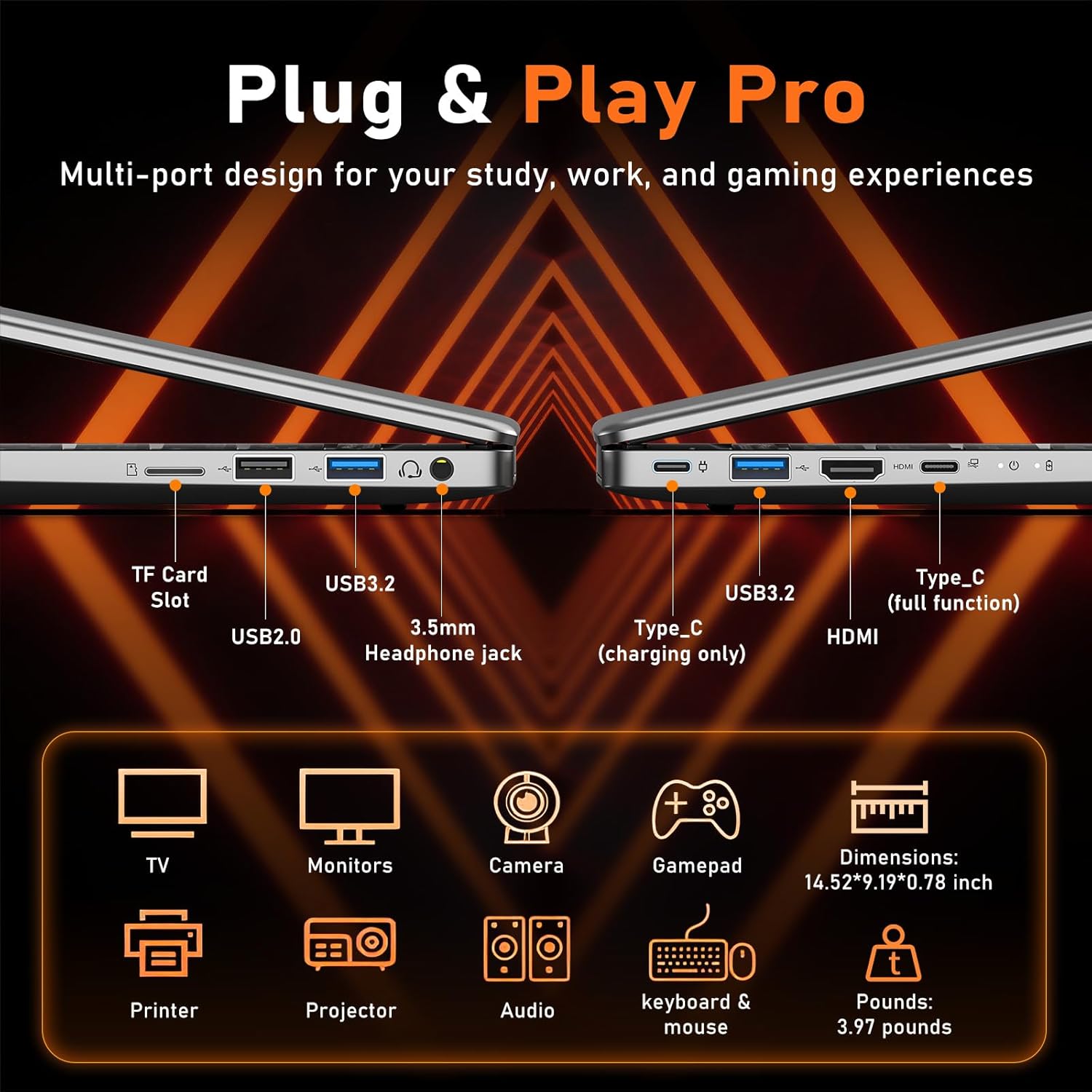 En el apartado de puertos, la versatilidad es absoluta: cuenta con USB 3.2 Gen1, HDMI 2.0, ranura para tarjetas TF y puertos USB Type-C multifuncionales y de carga PD. Además, estarás siempre a la máxima velocidad gracias al soporte para Wi-Fi 6 y Bluetooth 5.2, garantizando estabilidad incluso en redes saturadas. Con su batería de 51,97 Wh, el AM-02 es el compañero ideal para jornadas intensas de trabajo o estudio móvil.