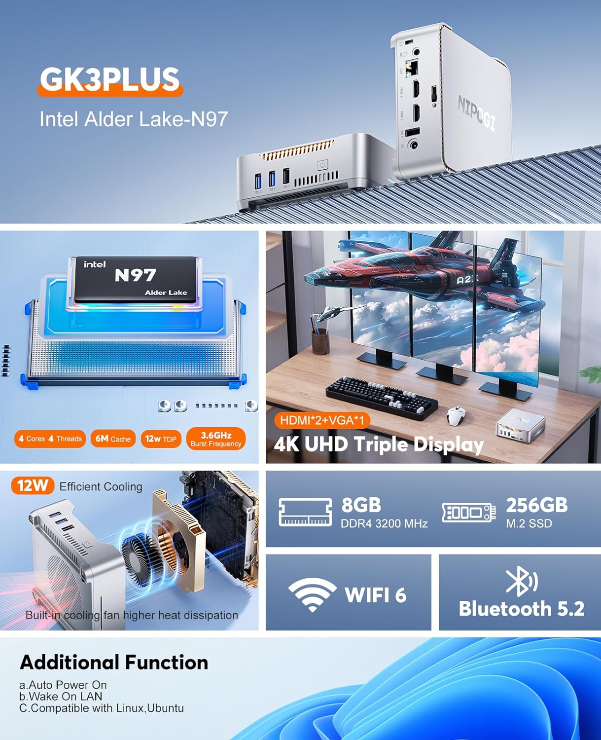 Además de su potencia y funcionalidad, la GK3 Plus destaca por su diseño compacto y versátil. Con unas dimensiones de apenas 12,8 x 12,8 x 5,2 centímetros y un soporte VESA, esta mini PC puede ser fácilmente instalada en la parte posterior de tu monitor, liberando espacio en tu escritorio y proporcionando una estética ordenada y minimalista. Su carcasa plateada no solo es elegante, sino que también mejora la disipación del calor, garantizando un funcionamiento continuo y estable incluso en las condiciones más exigentes.