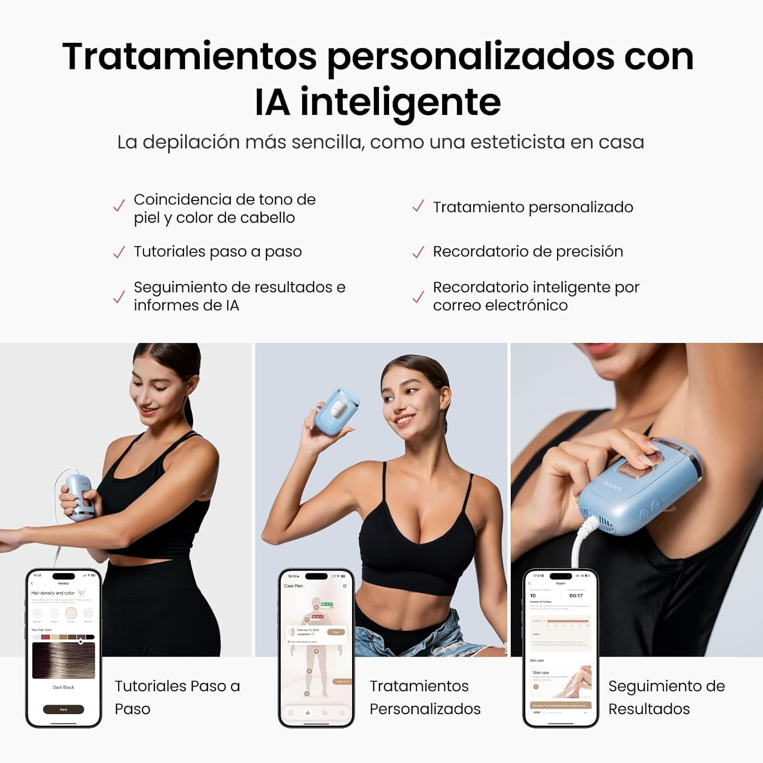 La Nova P5 también incorpora una AI Coaching APP, una aplicación inteligente que actúa como tu esteticista personal en casa. Esta herramienta recomienda la energía adecuada y el tratamiento más efectivo según tu tono de piel, el color y el grosor del vello. Además, ofrece un seguimiento en tiempo real para garantizar una depilación precisa y profesional, adaptada a tus necesidades específicas. Con esta función, cada sesión se convierte en un proceso personalizado que maximiza los resultados y minimiza los riesgos.
