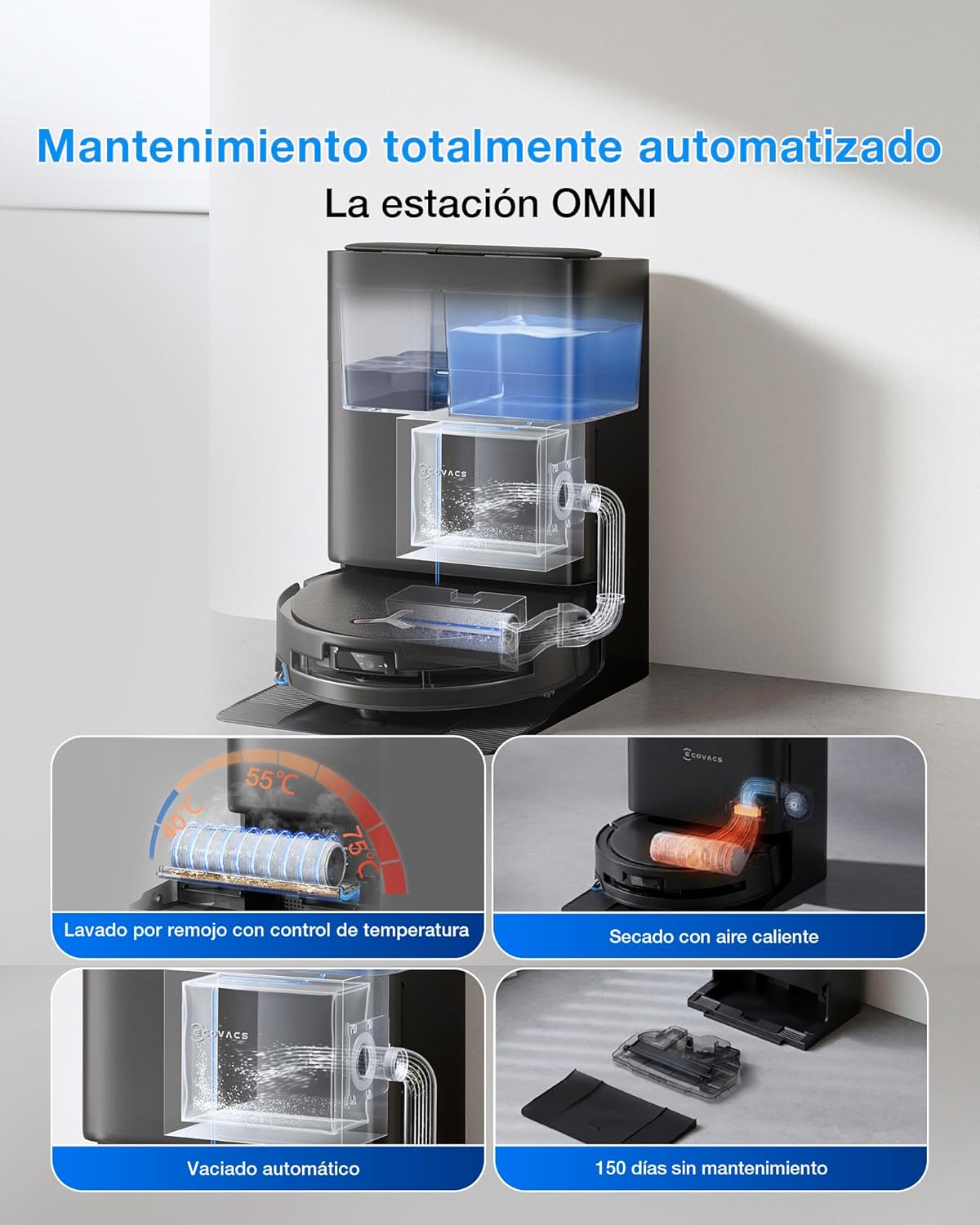 La experiencia premium se completa con la estación de carga, que ofrece un mantenimiento mínimo. El sistema de control de temperatura permite lavar la mopa con agua a entre 40 y 75 °C, eliminando bacterias y grasa de forma eficaz. Posteriormente, un flujo de aire caliente a 45 °C seca el rodillo en solo dos horas, evitando la proliferación de olores. Con un depósito de polvo que solo requiere vaciado cada 90 días y una bandeja de autolimpieza diseñada para durar hasta 150 días sin mantenimiento, el Ecovacs Deebot T80S Omni ofrece, por fin, la libertad que el usuario de tecnología avanzada demanda.