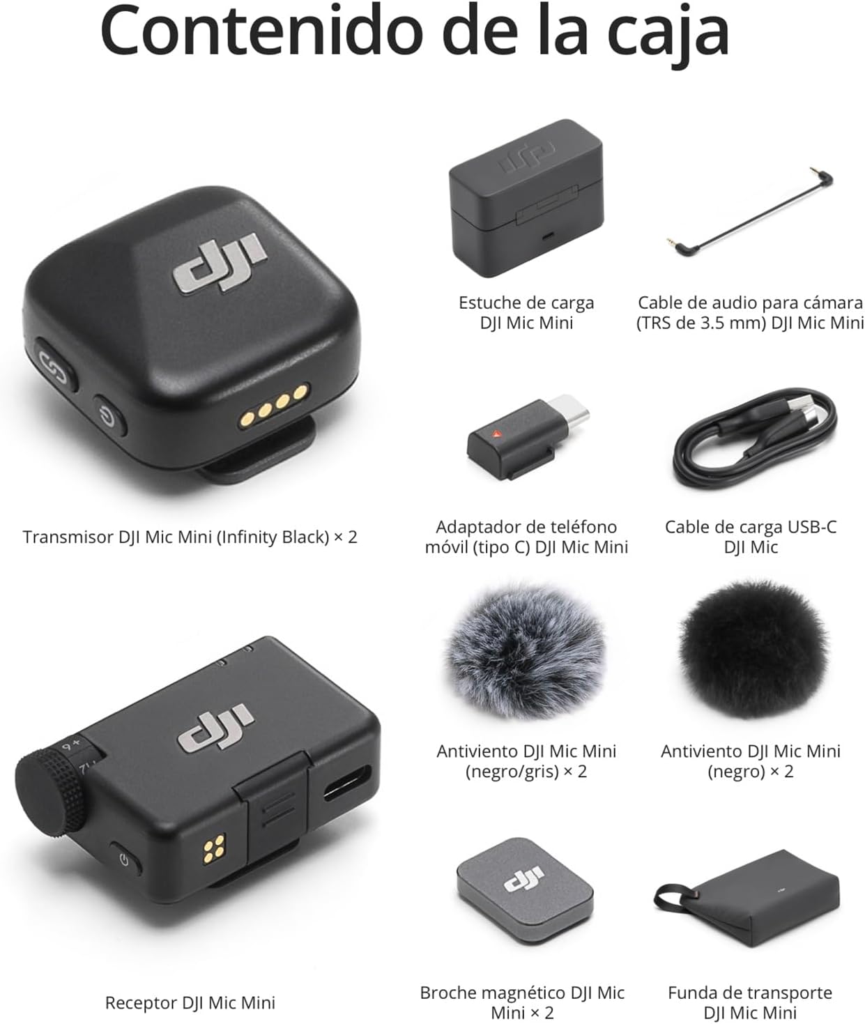 El pack completo incluye dos transmisores (TX), un receptor (RX), un estuche de carga y varios accesorios, lo que lo convierte en una solución integral para múltiples escenarios. Desde entrevistas profesionales hasta streaming en directo, pasando por la creación de contenido para redes sociales, el DJI Mic Mini ofrece todo lo necesario para empezar a grabar con calidad superior desde el primer momento.
