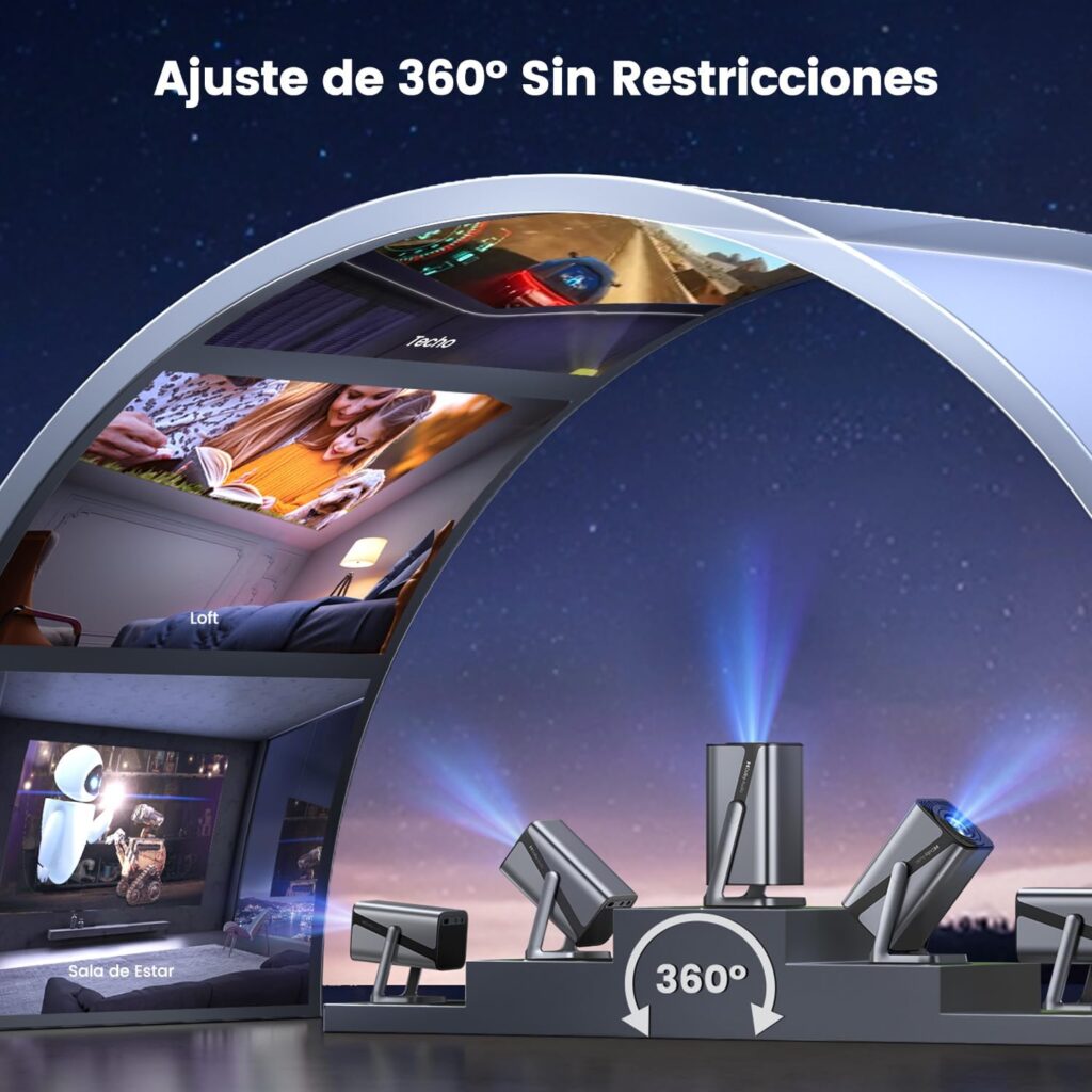 La versatilidad del S29 se amplía con su base giratoria de 360°, que permite ajustar el ángulo de proyección sin necesidad de soportes externos. Puedes proyectar en cualquier dirección, adaptando el dispositivo a tu espacio sin esfuerzo. Y si necesitas ajustar el tamaño de la imagen, el zoom digital del 100% al 50% te permite hacerlo sin mover el proyector, manteniendo la calidad y el encuadre.Pensado para facilitar la integración en tu sistema de entretenimiento, el iWIMIUS S29 incluye HDMI-CEC, que permite controlar dispositivos como Fire TV Stick, consolas o barras de sonido directamente desde el mando del proyector. También incorpora HDMI ARC, ideal para conectar sistemas de audio mediante un solo cable, simplificando la configuración de tu cine en casa.