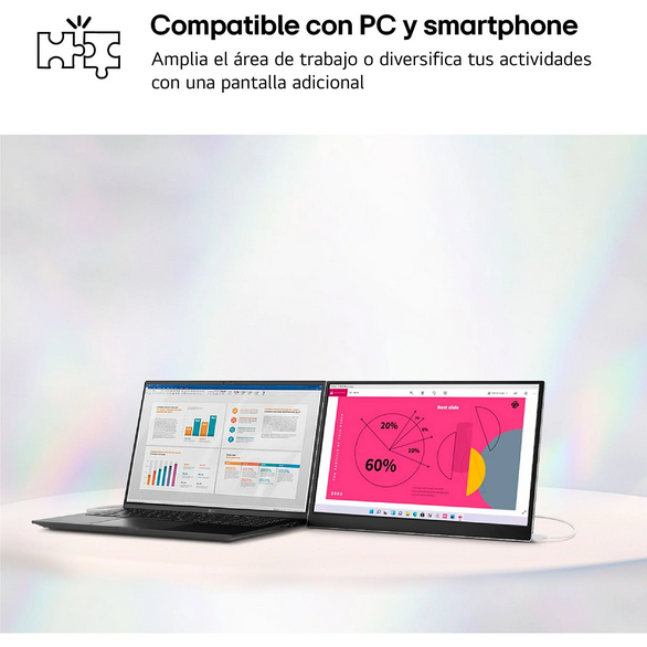 Con una pantalla de 16 pulgadas y la innovadora tecnología gram +view, este dispositivo está diseñado para complementar de manera perfecta al portátil LG gram 16, ofreciendo una experiencia visual más amplia y versátil que potencia la productividad en cualquier entorno.La filosofía detrás de este monitor es clara: amplía, expande y aumenta tu gram. Gracias a su diseño ligero y portátil, el LG 16MR70 permite transformar cualquier lugar en una oficina improvisada, un estudio creativo o un espacio de entretenimiento. Su integración con los portátiles LG gram convierte la multitarea en algo natural, ofreciendo una pantalla adicional que facilita la organización de proyectos, la edición de contenido o la visualización simultánea de documentos y videollamadas.