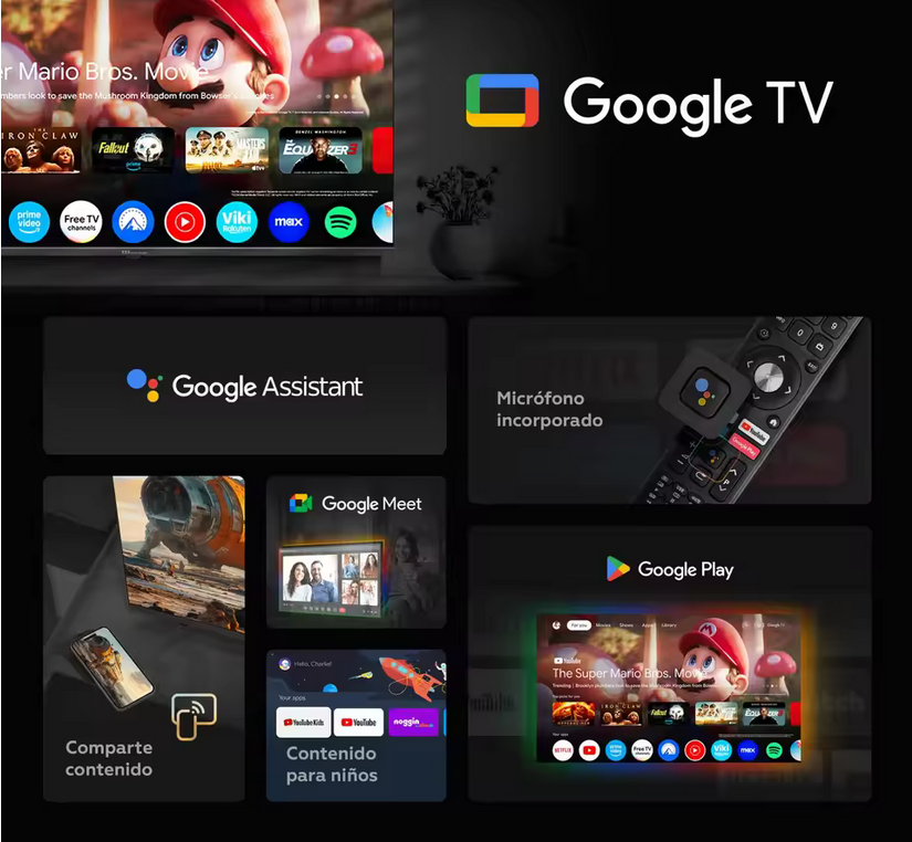 Equipado con Android 14 Google TV, el televisor ofrece una interfaz moderna, intuitiva y optimizada para acceder a miles de aplicaciones y servicios de streaming. Con Google Chromecast integrado, es posible enviar contenido directamente desde el móvil, la tablet o el ordenador al televisor, de forma rápida y sencilla. Además, la inteligencia artificial y el Google Assistant con control por voz permiten gestionar el televisor y las aplicaciones mediante comandos hablados, lo que aporta comodidad y una experiencia más interactiva.