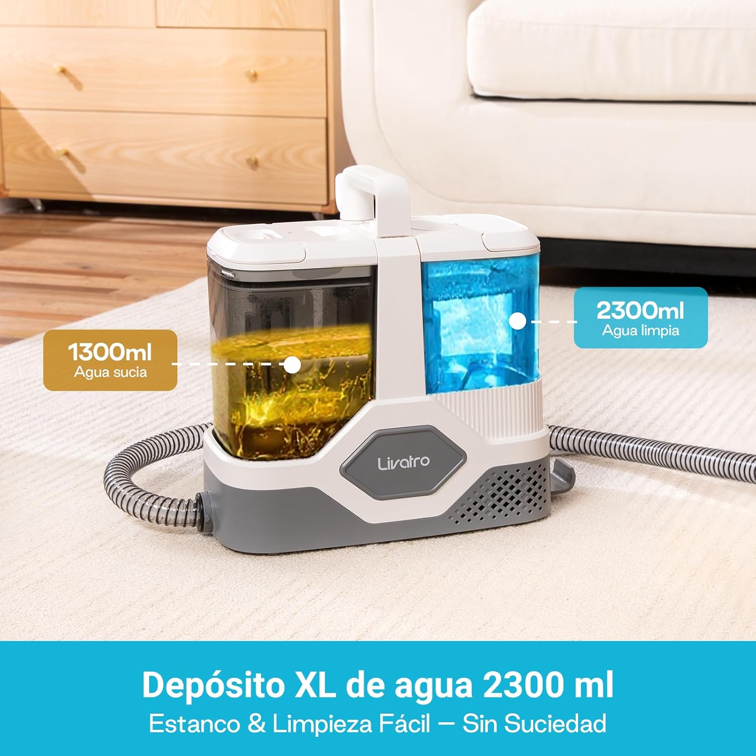 La gestión de líquidos es clave para una limpieza continua y efectiva. Livatro incorpora un sistema de depósito dual de gran capacidad, con un tanque de agua limpia de 2.3 L y uno de agua sucia de 1.3 L. Esta separación total asegura que siempre estés lavando con agua higienizada, evitando la redistribución de gérmenes. Además, su estructura inteligente con cierre a presión antiderrames permite mover la máquina por toda la casa sin temor a goteos o fugas accidentales sobre suelos delicados.Con un peso de solo 3.8 kg, es un dispositivo extremadamente ligero y maniobrable. Su radio de acción de 6.3 metros (gracias a un cable de 5m y una manguera flexible de 1.28m) la convierte en la aliada ideal para detallado automotriz, limpieza de peldaños de escaleras y rincones de difícil acceso en el salón. Para adaptarse a cada superficie, el set profesional incluye: