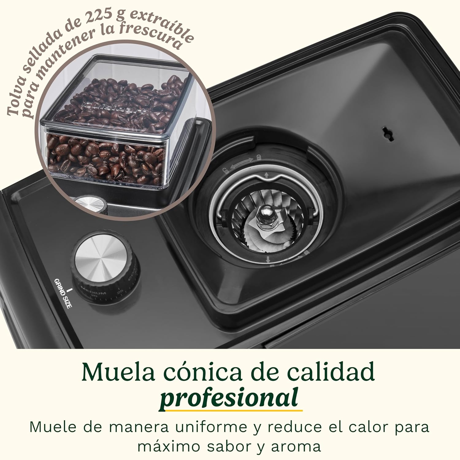 Además, su selector de tazas ajustable permite procesar la cantidad exacta para 1 a 14 tazas, evitando el desperdicio y asegurando que solo muelas lo que vas a consumir al instante. La frescura es el pilar del café de calidad. Este modelo incorpora una tolva de 225 g con una tapa sellada de silicona de alta seguridad, diseñada específicamente para mantener los granos protegidos del aire y la humedad. Una vez iniciado el proceso, la innovadora tecnología antiestática marca la diferencia en tu cocina: evita que el café molido se adhiera a las paredes del recipiente o de la máquina, eliminando el desorden en la encimera y facilitando una limpieza inmediata.