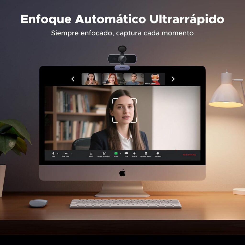 La versatilidad es el núcleo de este dispositivo. Mientras que su modo 4K a 30 FPS es ideal para creadores de contenido y conferencias de alto nivel donde el detalle es soberano, la cámara permite conmutar a 1080p a 60 FPS. Esta última configuración es la preferida por streamers y jugadores, ya que garantiza una fluidez de movimiento orgánica, eliminando el parpadeo y las estelas en escenas de acción rápida. Uno de los mayores diferenciales de la propuesta de Ugreen es la implementación del autoenfoque PDAF (Phase Detection Auto Focus). A diferencia del enfoque por contraste (CDAF) convencional —que a menudo «busca» el foco de manera errática—, el sistema PDAF es instantáneo. Capaz de detectar y fijar rostros en un rango de 0,1 a 5 metros, garantiza que el usuario sea siempre el centro de atención, manteniendo la estabilidad de la imagen incluso si te acercas a la lente para mostrar un documento o producto. Además, su sistema de corrección de luz inteligente ajusta la temperatura de color en tiempo real, compensando las sombras duras o la luz artificial amarillenta para que siempre luzcas profesional, sin importar la hora del día.