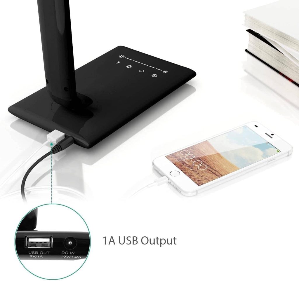 Esta lámpara de escritorio trabaja con eficientes bombillas Led que serán capaces de aportarnos la intensidad de luz precisa en cada momento, consiguiendo una iluminación tenue o brillante según lo deseemos, y que además al tratarse de una luz fija y uniforme, no cuenta con molestos parpadeos que puedan conseguir que nuestra vista se fatigue en poco tiempo. Además de todas las características descritas, este modelo integra un puerto USB a través del cual podrás cargar dispositivos como la tablet, batería externa o el móvil mientras estás trabajando o estudiando con una potencia de 5W 1A, por lo que no será necesario ocupar otro enchufe para ello.Es perfecta no solo para zonas de estudio o de trabajo, sino también como elemento decorativo en mesas de salón o mesitas de noche, ya que al poder controlar la intensidad y el brillo de iluminación en cada momento, nos ayudará a crear ambiente para disfrutar de una buena sesión de cine, un maratón de tu serie favorita, o como luz nocturna creando una luz tenue y suave en habitaciones para ayudarnos a conciliar el sueño o evitar que los más pequeños tengan miedo si se despiertan y que les permitirá dormir con ella encendida sin que resulte molesta.