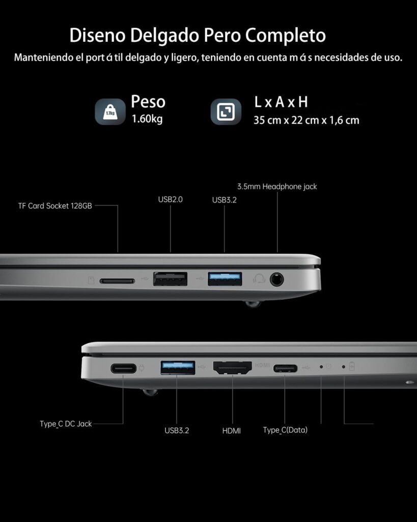 En cuanto a conectividad, este portátil cubre todas las bases. El Wi-Fi 802.11a/b/g/n/ac garantiza descargas veloces y señal estable, mientras que el Bluetooth 5.0 te conecta con altavoces, auriculares o ratones inalámbricos de forma inmediata. A nivel físico, dispone de dos puertos USB 3.2 para transferencias ultrarrápidas, un USB 2.0, un conector de audio de 3,5 mm, salida HDMI para monitor externo o proyector y un puerto RJ45 Ethernet para redes cableadas. No importa el entorno: podrás enlazar teclado, ratón, disco duro y pantallas adicionales sin complicaciones.La batería de iones de litio de 4,49 Wh/5000mAh ofrece autonomía suficiente para soportar varias horas de uso diario; su diseño ligero contribuye a mantener el peso bajo, al mismo tiempo que su capacidad resulta adecuada para tareas ofimáticas, navegación web o videoconferencias continuas. Gracias al equilibrio entre eficiencia energética y potencia, puedes trabajar o entretenerte sin tener que buscar punto de carga cada poco tiempo.