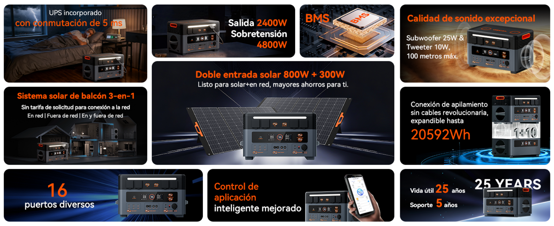 El generador solar Oscal PM2400 ofrece una potencia nominal de 2400 W y una potencia máxima de 4800 W, lo que lo convierte en una herramienta versátil para cubrir las necesidades del 99,9% de los hogares. Su batería LFP de 1872 Wh garantiza autonomía suficiente para emergencias domésticas, actividades de camping al aire libre o incluso para pequeñas empresas que necesitan un respaldo confiable. Esta capacidad robusta lo posiciona como una alternativa ecológica y eficiente frente a los generadores tradicionales, sin emisiones ni gases nocivos.
