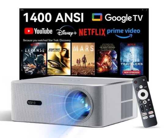 Uno de los mayores obstáculos de los proyectores tradicionales es la tediosa configuración manual. El Oscal PV800 Pro soluciona esto mediante su sistema de enfoque automático y corrección trapezoidal automática. Al encender el dispositivo, sensores internos ajustan la geometría de la imagen y la nitidez en cuestión de segundos, permitiendo que el usuario se centre en el contenido y no en el hardware. Ya sea en una mesita de noche o colgado del techo, la imagen siempre lucirá perfecta. La verdadera ventaja competitiva de este modelo es la integración de Google TV (Android 11). Esto significa acceso nativo y certificado a más de 10,000 aplicaciones, incluyendo gigantes como Netflix, Disney+ y YouTube, controlables directamente mediante comandos de voz. Olvídate de cables externos o «dongles» adicionales; todo el catálogo de streaming está a un clic de distancia.