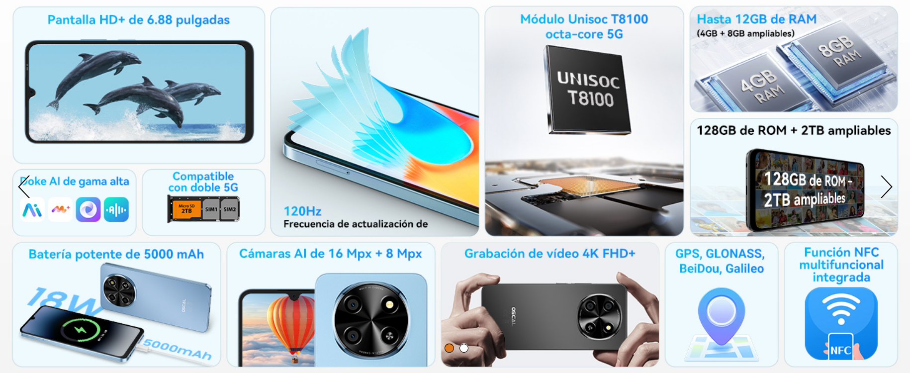 El OSCAL Tiger 8 5G es un smartphone diseñado para usuarios que buscan una pantalla grande, rendimiento fluido y autonomía sólida sin disparar el presupuesto. Combina una pantalla HD+ de 6,88 pulgadas con tasa de refresco 120 Hz, conectividad 5G, un procesador octa-core potente y una batería de 5000 mAh, todo ello bajo Android 15 con la capa DokeOS 4.2 para una experiencia personalizada y segura.